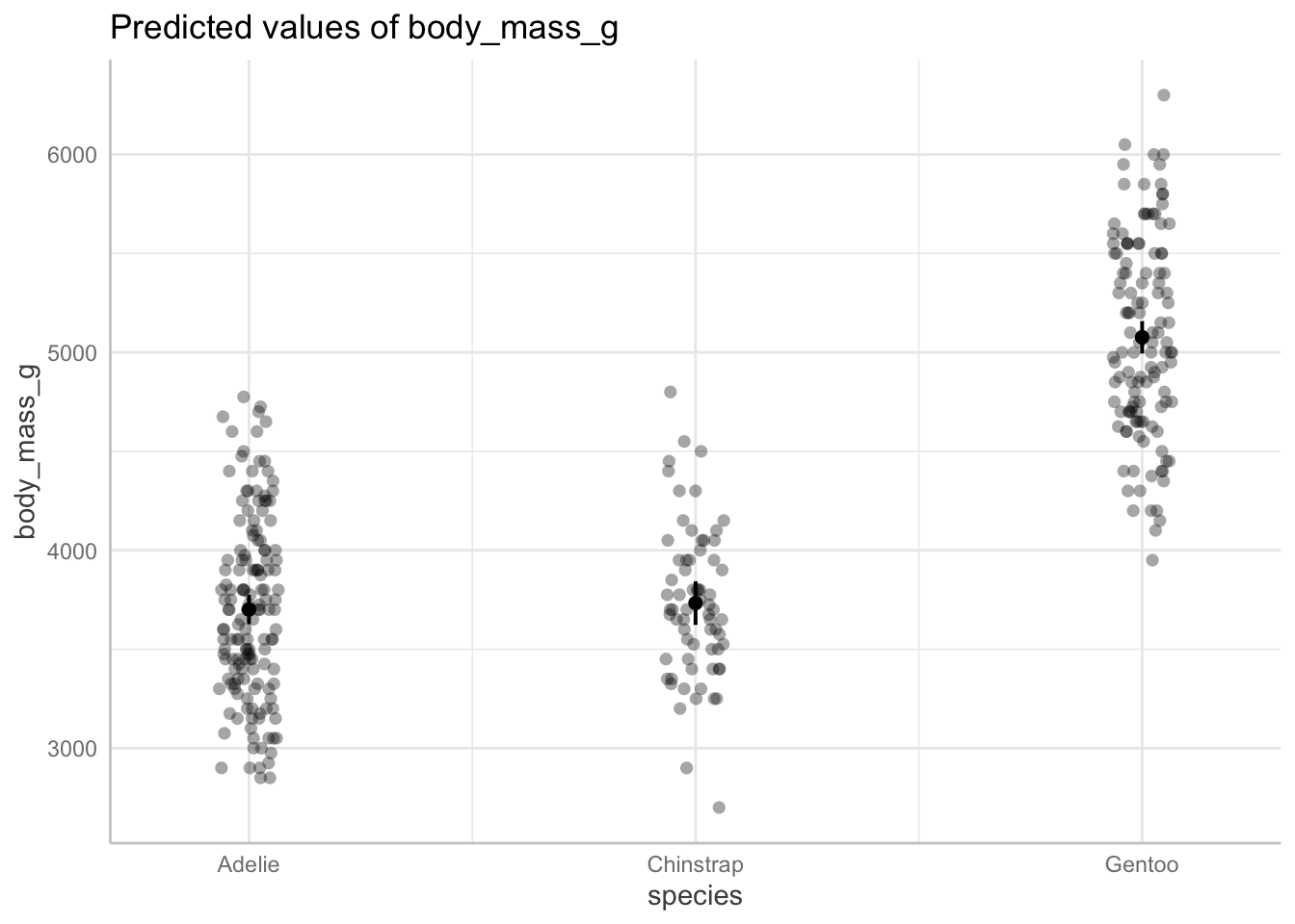 terms = c("species")) # only predictor in the model is species# Predicted values of body_mass_g