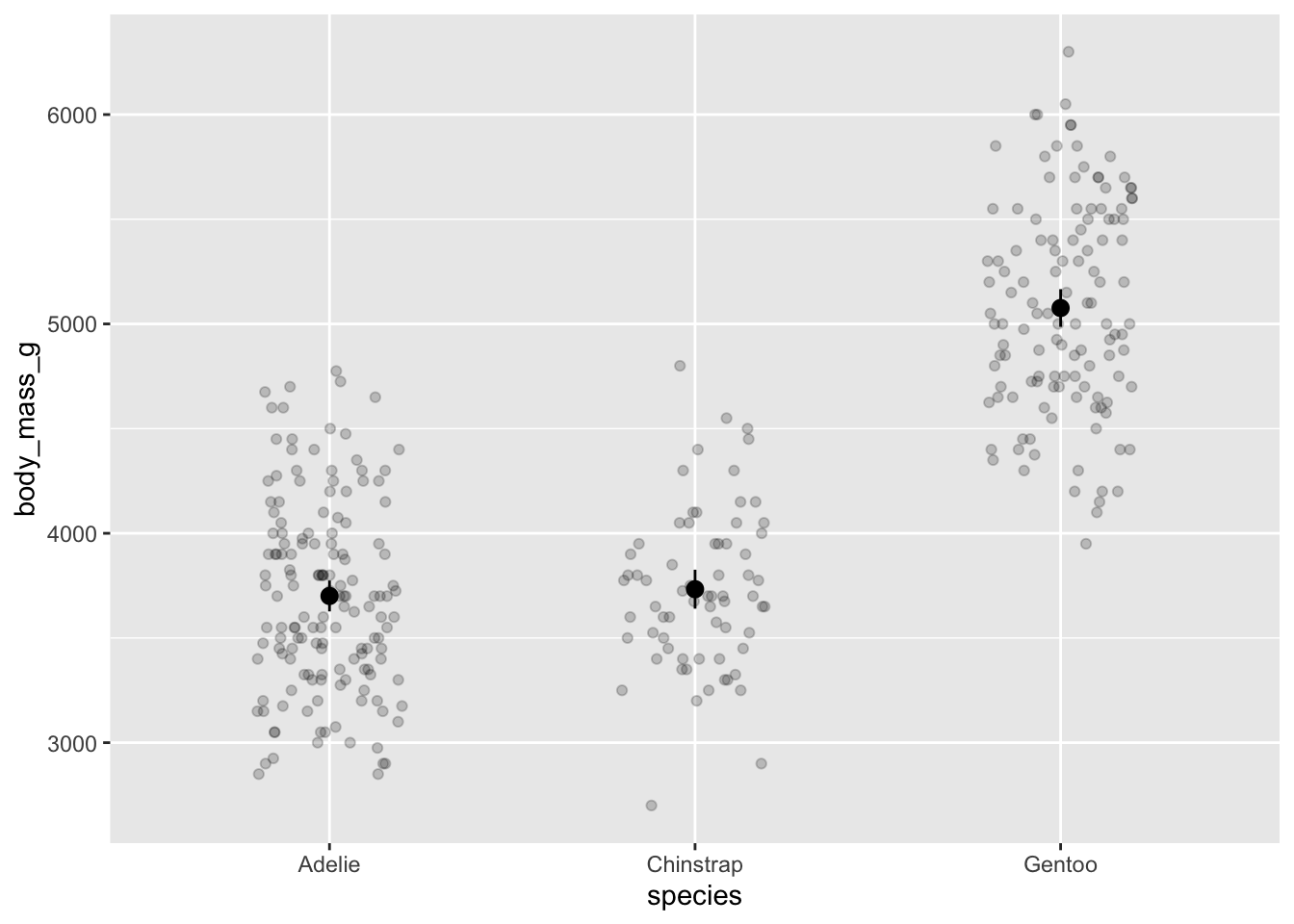 fun.data = mean_cl_normal) # calculating mean and 95% confidence intervalStop and think: do you think there’s a difference between species in body mass?