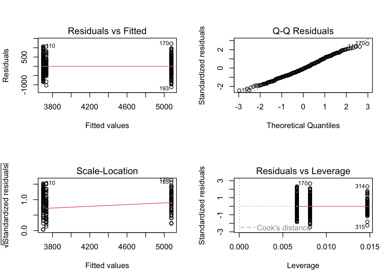 par(mfrow = c(2, 2)) # displaying all diagnostic plots in 2x2 grid