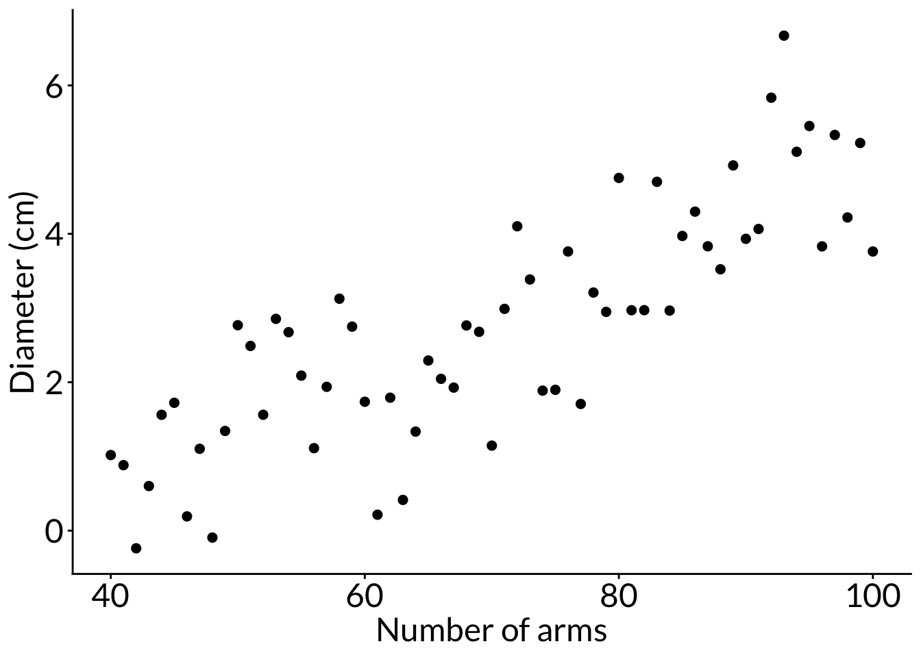 # number of arms arms <-seq(from =40, to =100, by =1)# diameter: anemones can be up to 8 cm longset.seed(10)diam <-rnorm(length(arms), mean =seq(from =1, to =5, length =length(arms)), sd =1) # create a data framedf <-cbind(diam, arms) %>%as.data.frame()ggplot(df, aes(x = arms, y = diam)) +geom_point(size =2) +labs(x ="Number of arms", y ="Diameter (cm)")