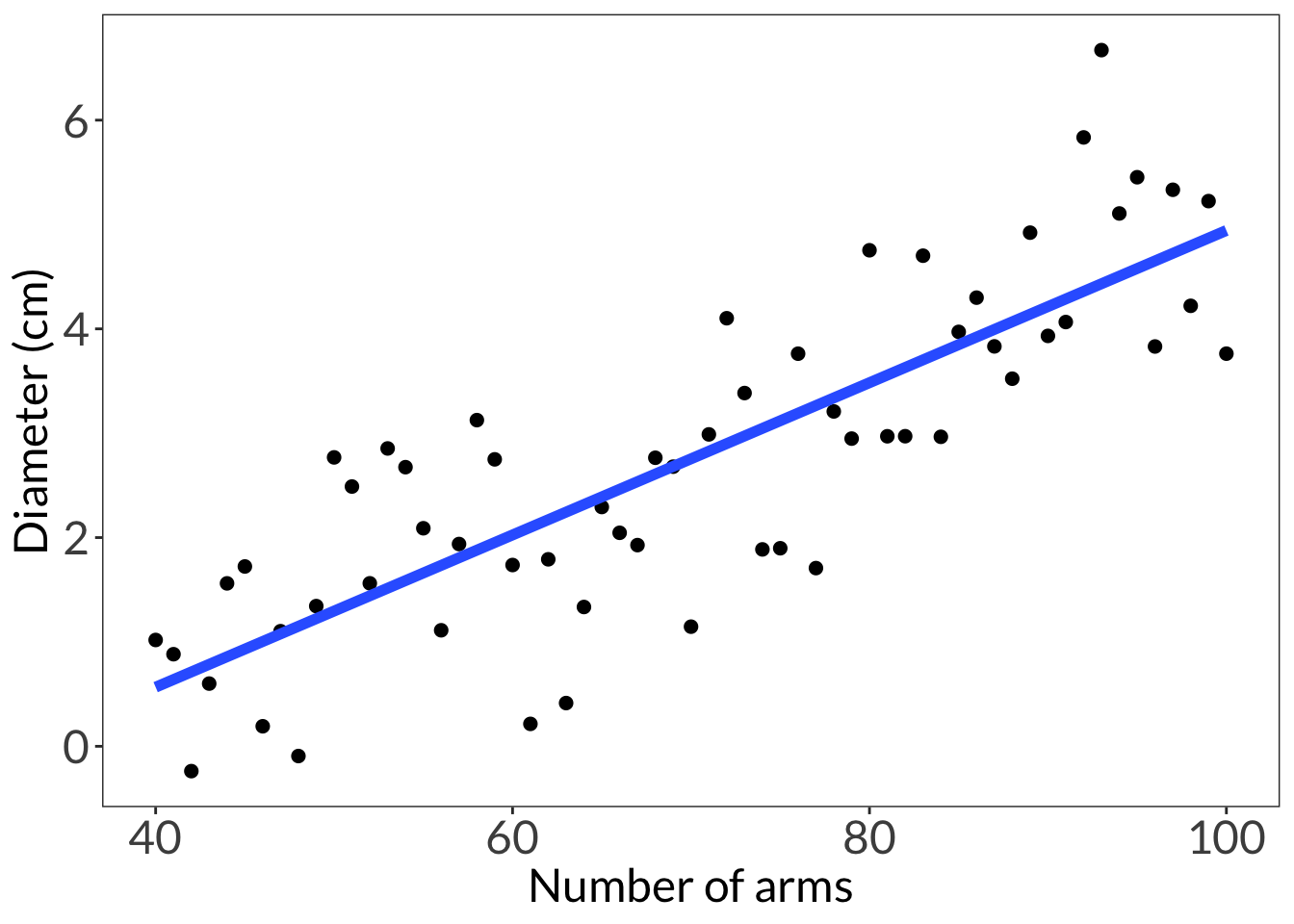 ggplot(df, aes(x = arms, y = diam)) +geom_point(size =2) +# just using geom smooth for the purposes of visualizationgeom_smooth(method ="lm", se =FALSE, linewidth =2) +labs(x ="Number of arms", y ="Diameter (cm)") +theme_bw() +theme(panel.grid =element_blank(),axis.text =element_text(size =18),axis.title =element_text(size =18),text =element_text(family ="Lato"))