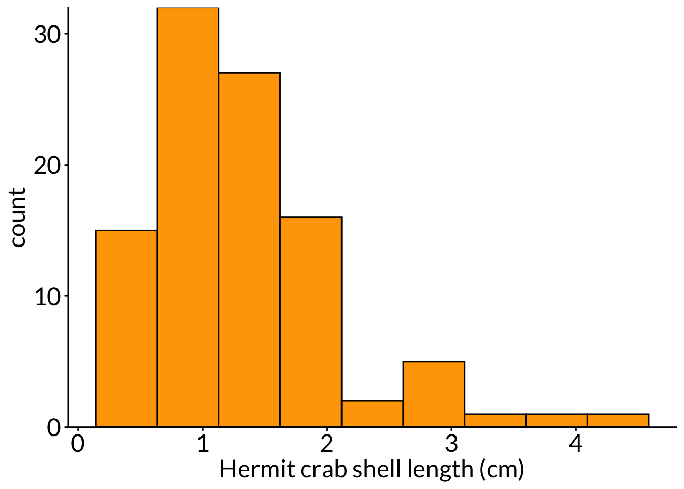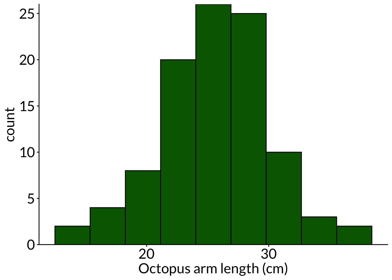 ggplot(df, aes(x = diam)) +scale_x_continuous(breaks =seq(from =0, to =8, by =1)) +scale_y_continuous(expand =c(0, 0), limits =c(0, 19), breaks =seq(from =0, to =18, by =3)) +geom_histogram(color ="#000000", fill ="lightblue") +labs(x ="Anemone diameter (cm)", y ="Count") +theme(panel.grid =element_blank(),axis.text =element_text(size =18),axis.title =element_text(size =18),text =element_text(family ="Lato"))