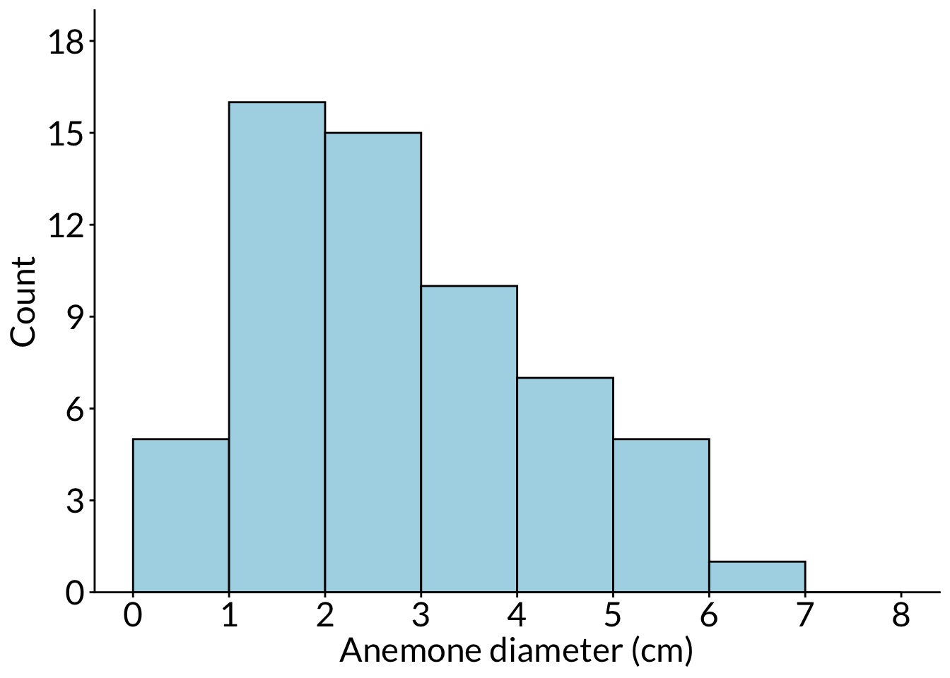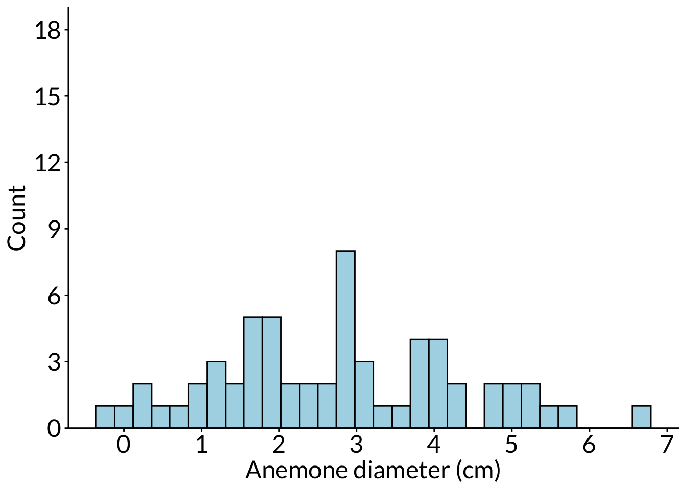 ggplot(df, aes(x = diam)) +scale_x_continuous(breaks =seq(from =0, to =8, by =1)) +scale_y_continuous(expand =c(0, 0), limits =c(0, 19), breaks =seq(from =0, to =18, by =3)) +geom_histogram(breaks =seq(from =0, to =8, by =1), color ="#000000", fill ="lightblue") +labs(x ="Anemone diameter (cm)", y ="Count") +theme(panel.grid =element_blank(),axis.text =element_text(size =18),axis.title =element_text(size =18),text =element_text(family ="Lato"))