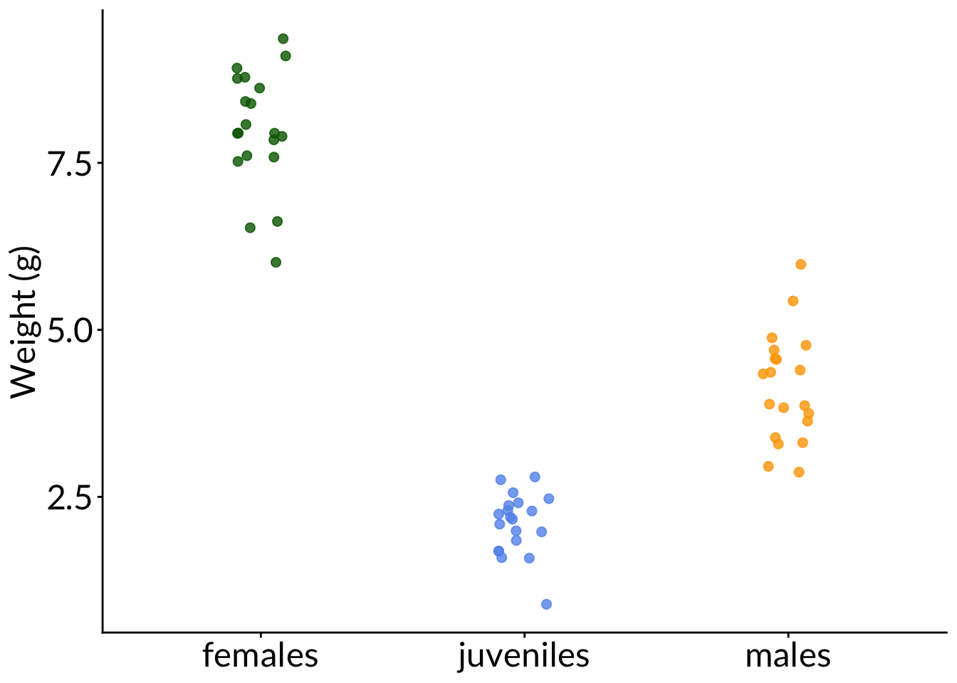 set.seed(1)pretend_lengths <-cbind(juveniles =rnorm(20, mean =2, sd =0.5), females =rnorm(20, mean =8, sd =1), males =rnorm(20, mean =4, sd =1)) %>%as_tibble() %>%pivot_longer(cols =1:3)ggplot(pretend_lengths, aes(x = name, y = value, color = name)) +geom_jitter(width =0.1, alpha =0.8, size =2) +scale_color_manual(values =c("darkgreen", "cornflowerblue", "orange")) +labs(y ="Weight (g)") +theme(axis.title.x =element_blank(),legend.position ="none")