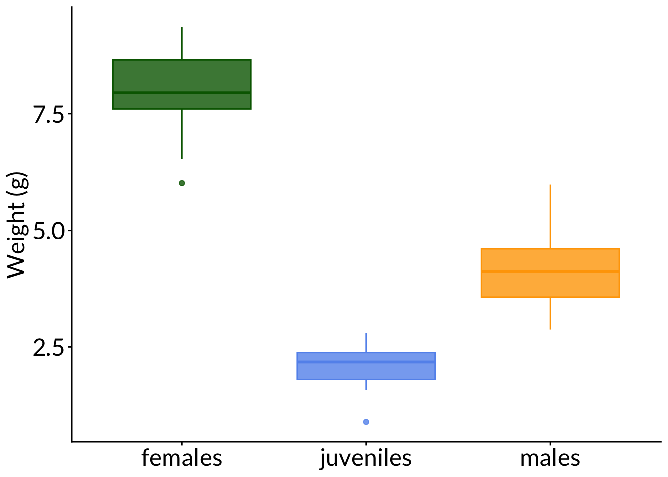 ggplot(pretend_lengths, aes(x = name, y = value, color = name, fill = name)) +geom_boxplot(alpha =0.8) +scale_color_manual(values =c("darkgreen", "cornflowerblue", "orange")) +scale_fill_manual(values =c("darkgreen", "cornflowerblue", "orange")) +labs(y ="Weight (g)") +theme(axis.title.x =element_blank(),legend.position ="none")