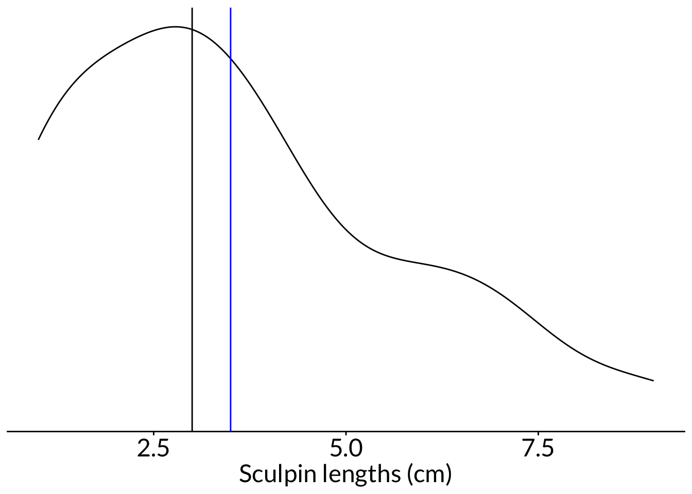 ggplot(df, aes(x = diam)) +scale_x_continuous(breaks =seq(from =0, to =8, by =1)) +scale_y_continuous(expand =c(0, 0)) +geom_histogram(color ="#000000", fill ="lightblue", bins =3) +labs(x ="Anemone diameter (cm)", y ="Count") +theme(panel.grid =element_blank(),axis.text =element_text(size =18),axis.title =element_text(size =18),text =element_text(family ="Lato"))