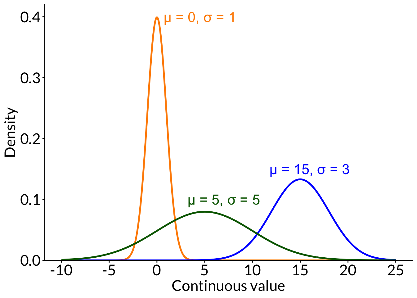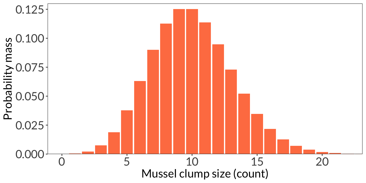 ggplot(data.frame(x =1:20), aes(x)) +stat_function(geom ="line", n =20, fun = dbinom, args =list(size =20, p =0.1), color ="black") +stat_function(geom ="point", n =20, fun = dbinom, args =list(size =20, p =0.1), color ="#6D9929", size =3) +annotate("text", x =5.5, y =0.29, label ="n = 20, p = 0.1", color ="#6D9929", size =6) +stat_function(geom ="line", n =20, fun = dbinom, args =list(size =20, p =0.4), color ="black") +stat_function(geom ="point", n =20, fun = dbinom, args =list(size =20, p =0.4), color ="#4A76E5", size =3) +annotate("text", x =8, y =0.2, label ="n = 20, p = 0.4", color ="#4A76E5", size =6) +stat_function(geom ="line", n =20, fun = dbinom, args =list(size =20, p =0.7), color ="black") +stat_function(geom ="point", n =20, fun = dbinom, args =list(size =20, p =0.7), color ="#E67960", size =3) +annotate("text", x =15, y =0.21, label ="n = 20, p = 0.7", color ="#E67960", size =6) +scale_y_continuous(expand =c(0, 0), limits =c(0, 0.32)) +labs(x ="Number of successes", y ="Mass") +theme_bw() +theme(panel.grid =element_blank(),axis.text =element_text(size =18),axis.title =element_text(size =18),text =element_text(family ="Lato"))