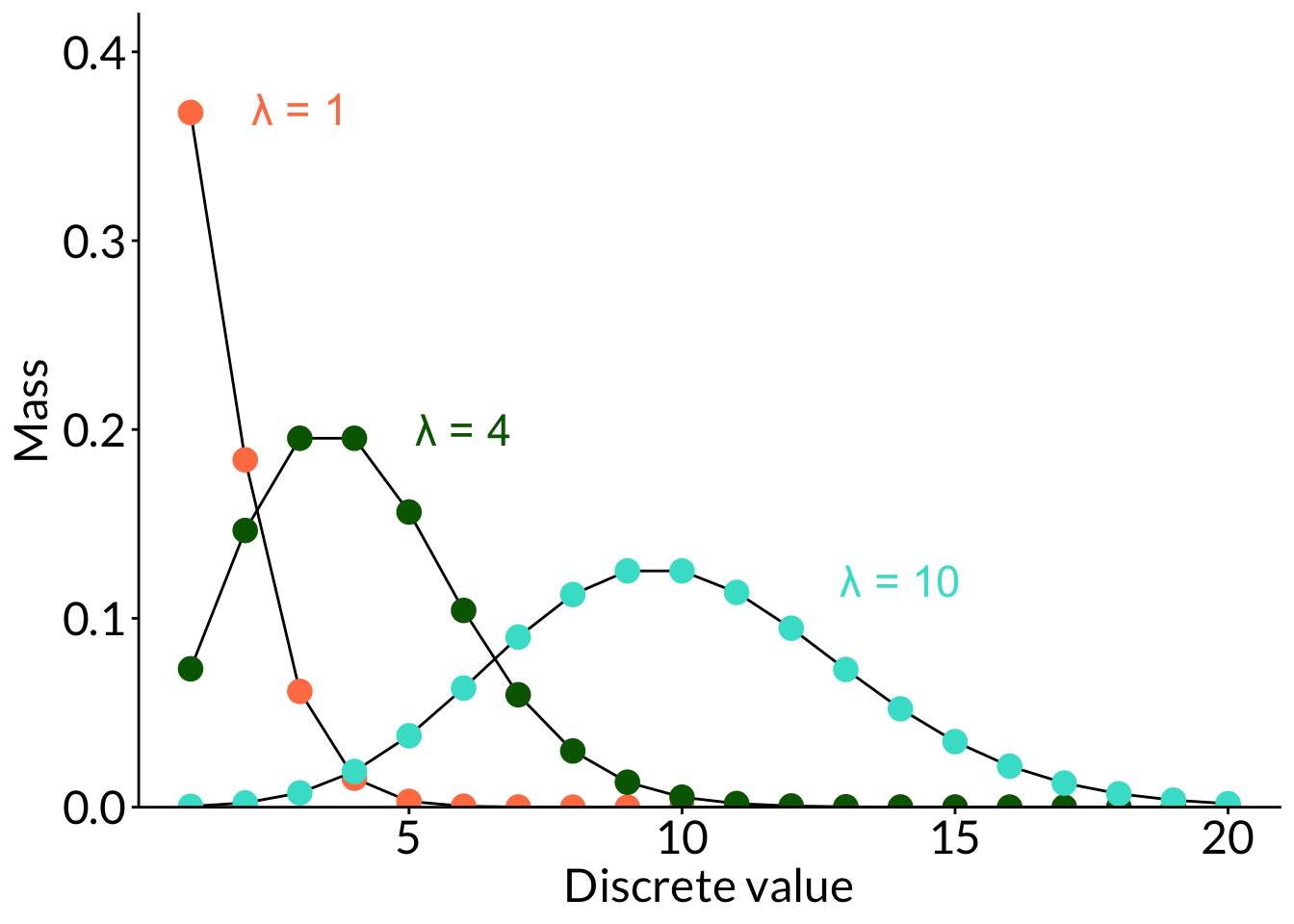 ggplot(data.frame(x =1:20), aes(x)) +stat_function(geom ="line", n =20, fun = dpois, args =list(lambda =1), color ="black") +stat_function(geom ="point", n =20, fun = dpois, args =list(lambda =1), color ="coral", size =4) +annotate("text", x =3, y =0.37, label ="\U03BB = 1", color ="coral", size =6) +stat_function(geom ="line", n =20, fun = dpois, args =list(lambda =4), color ="black") +stat_function(geom ="point", n =20, fun = dpois, args =list(lambda =4), color ="darkgreen", size =4) +annotate("text", x =6, y =0.2, label ="\U03BB = 4", color ="darkgreen", size =6) +stat_function(geom ="line", n =20, fun = dpois, args =list(lambda =10), color ="black") +stat_function(geom ="point", n =20, fun = dpois, args =list(lambda =10), color ="turquoise", size =4) +annotate("text", x =14, y =0.12, label ="\U03BB = 10", color ="turquoise", size =6) +scale_y_continuous(expand =c(0, 0), limits =c(0, 0.42)) +labs(x ="Discrete value", y ="Mass")
