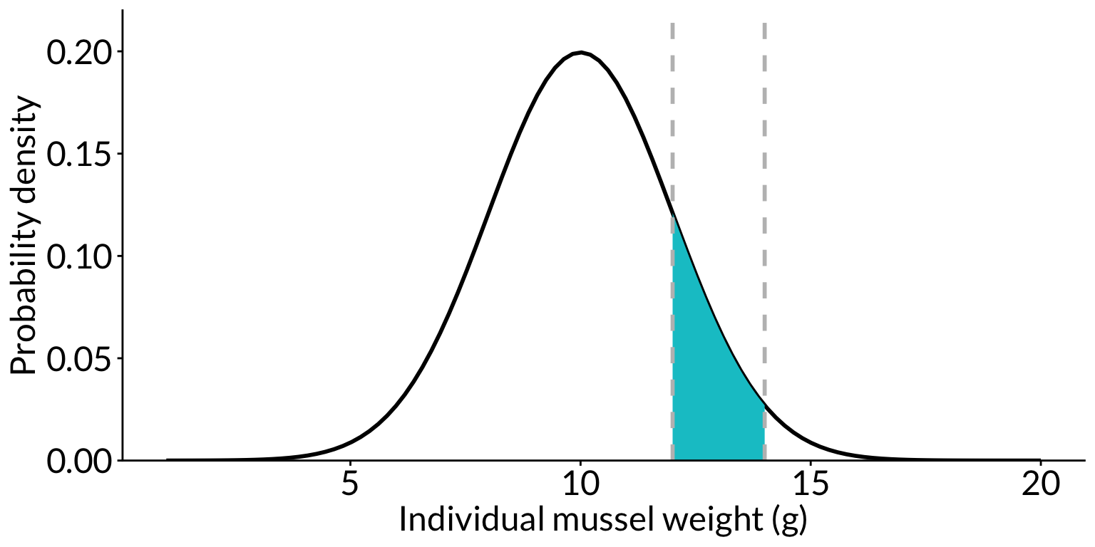 # calculate the z-scorechiton_z <- (6-12)/3# calculate the probability under the curvepnorm(chiton_z, mean =0, sd =1)