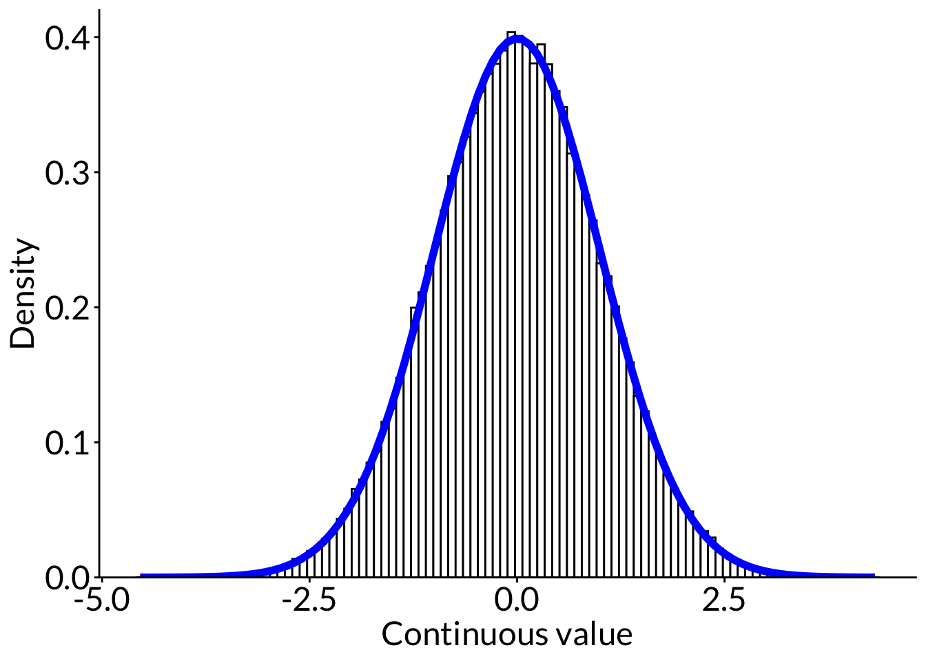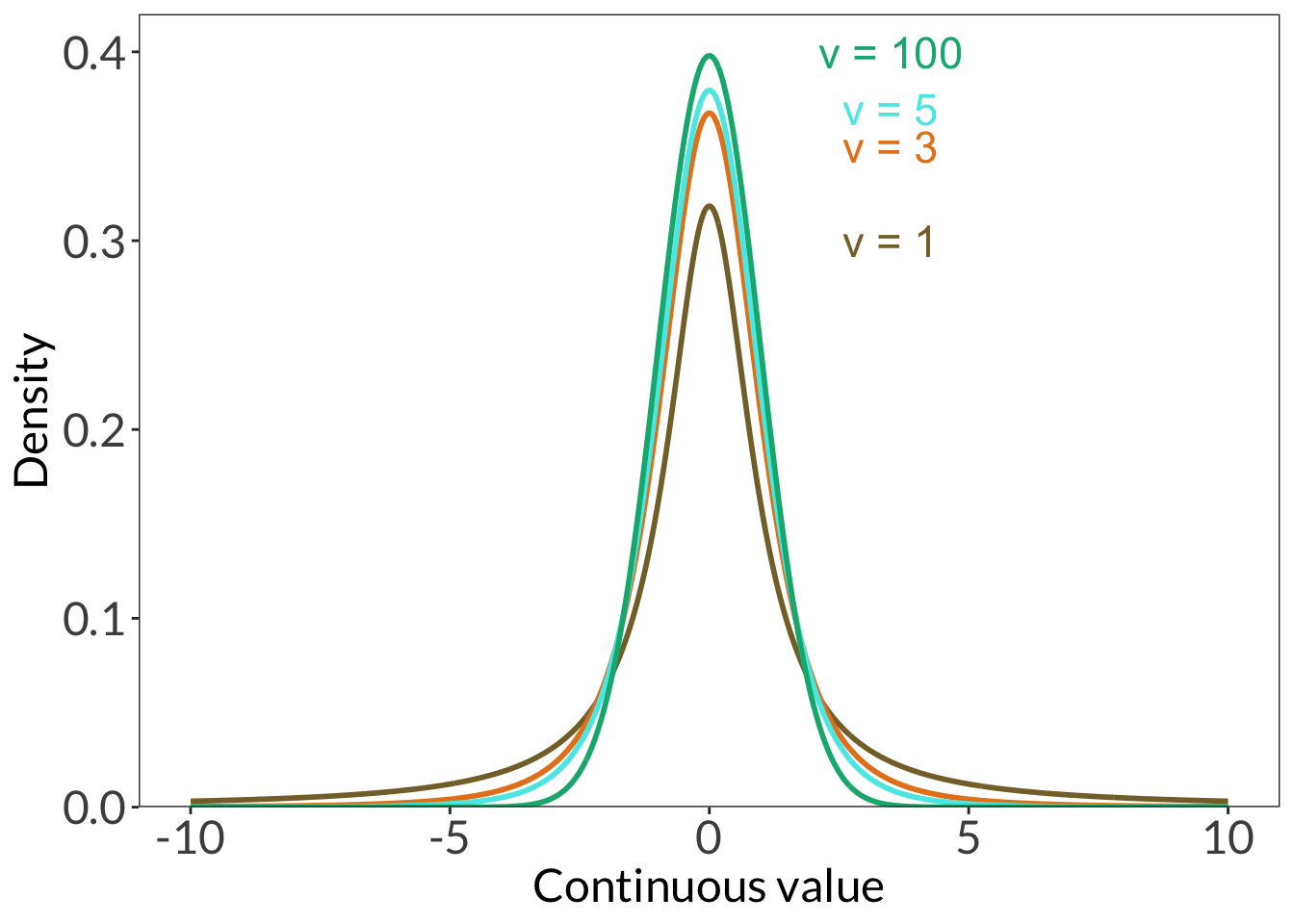 ggplot(data.frame(x =-10:10), aes(x)) +stat_function(geom ="line", n =1000, fun = dt, args =list(df =1), linewidth =1, color ="#856F33") +annotate("text", x =3.5, y =0.3, label ="\U03BD = 1", color ="#856F33", size =6) +stat_function(geom ="line", n =1000, fun = dt, args =list(df =3), linewidth =1, color ="#E6821C") +annotate("text", x =3.5, y =0.35, label ="\U03BD = 3", color ="#E6821C", size =6) +stat_function(geom ="line", n =1000, fun = dt, args =list(df =5), linewidth =1, color ="#56E9E7") +annotate("text", x =3.5, y =0.37, label ="\U03BD = 5", color ="#56E9E7", size =6) +stat_function(geom ="line", n =1000, fun = dt, args =list(df =100), linewidth =1, color ="#04B37F") +annotate("text", x =3.5, y =0.4, label ="\U03BD = 100", color ="#04B37F", size =6) +scale_y_continuous(expand =c(0, 0), limits =c(0, 0.42)) +labs(x ="Continuous value", y ="Density") +theme_bw() +theme(panel.grid =element_blank(),axis.text =element_text(size =18),axis.title =element_text(size =18),text =element_text(family ="Lato"))