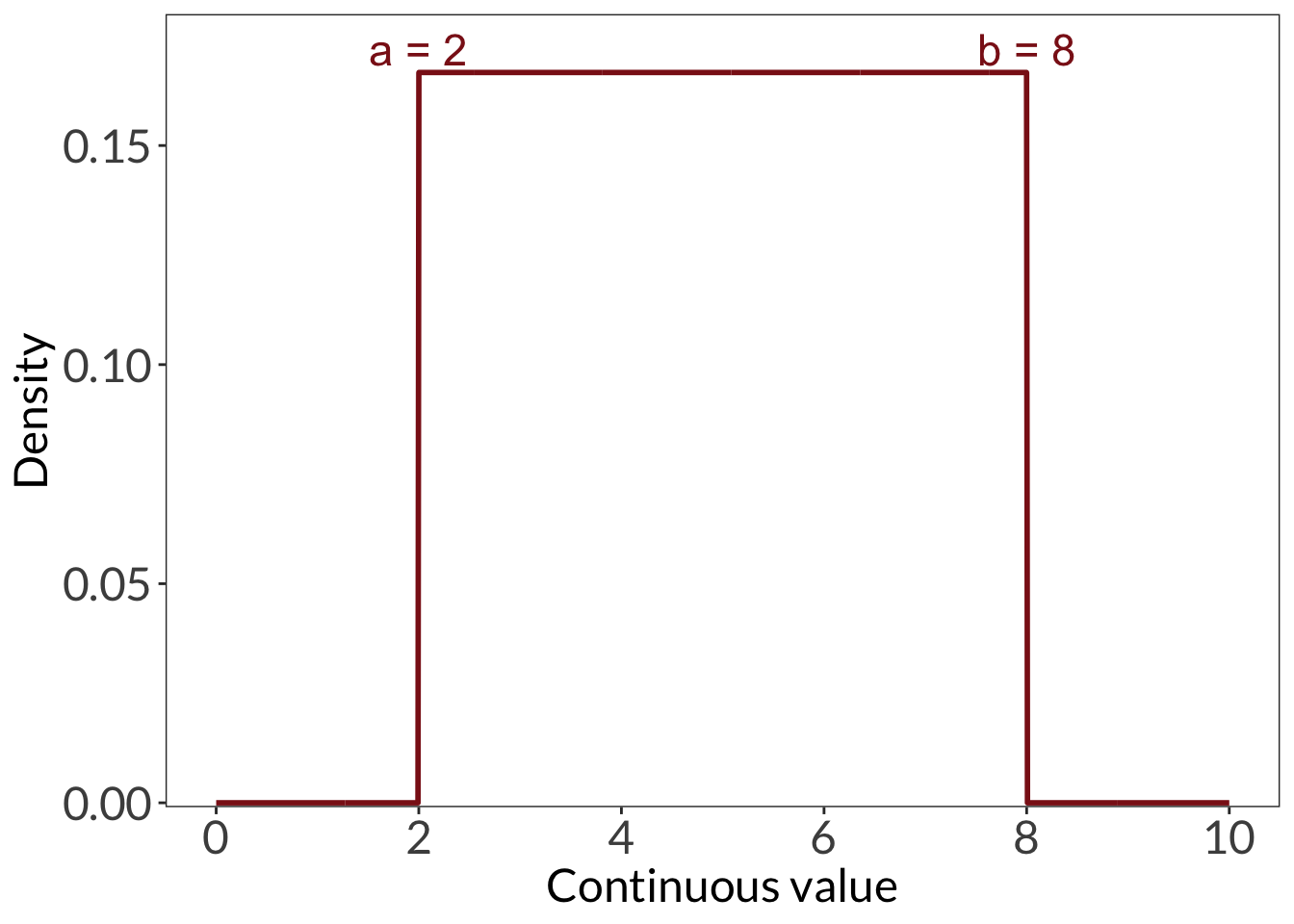 ggplot(data.frame(x =0:10), aes(x)) +stat_function(geom ="line", n =1000, fun = dunif, args =list(min =2, max =8), linewidth =1, color ="firebrick4") +annotate("text", x =2, y =0.172, label ="a = 2", color ="firebrick4", size =6) +annotate("text", x =8, y =0.172, label ="b = 8", color ="firebrick4", size =6) +scale_x_continuous(breaks =seq(0, 10, 2)) +scale_y_continuous(expand =c(0, 0), limits =c(-0.001, 0.18)) +labs(x ="Continuous value", y ="Density") +theme_bw() +theme(panel.grid =element_blank(),axis.text =element_text(size =18),axis.title =element_text(size =18),text =element_text(family ="Lato"))