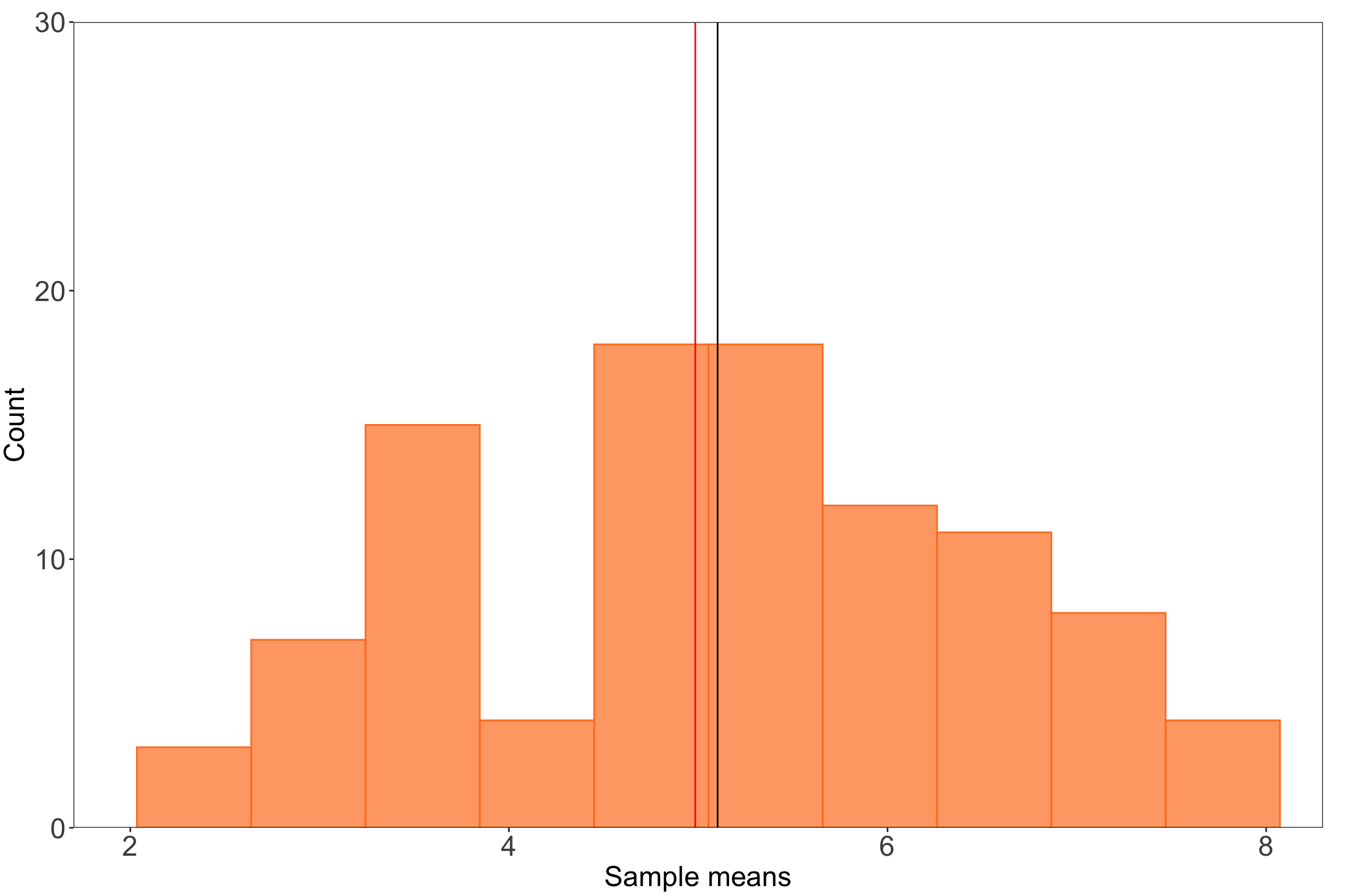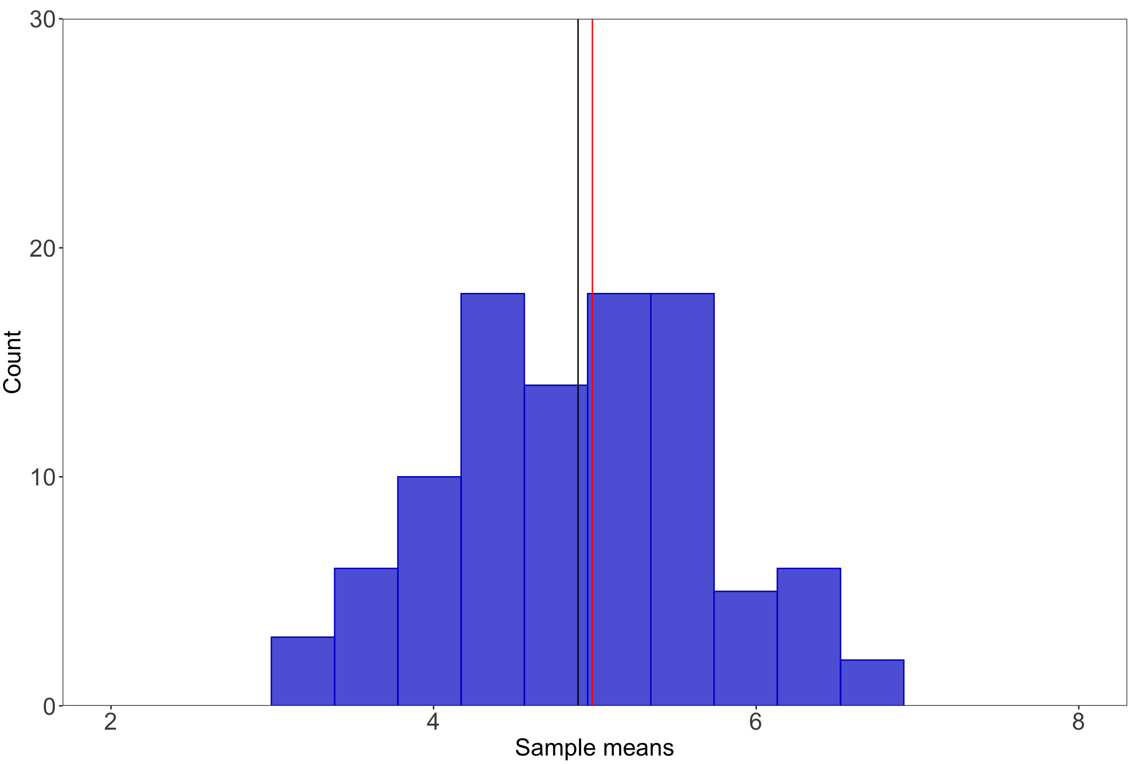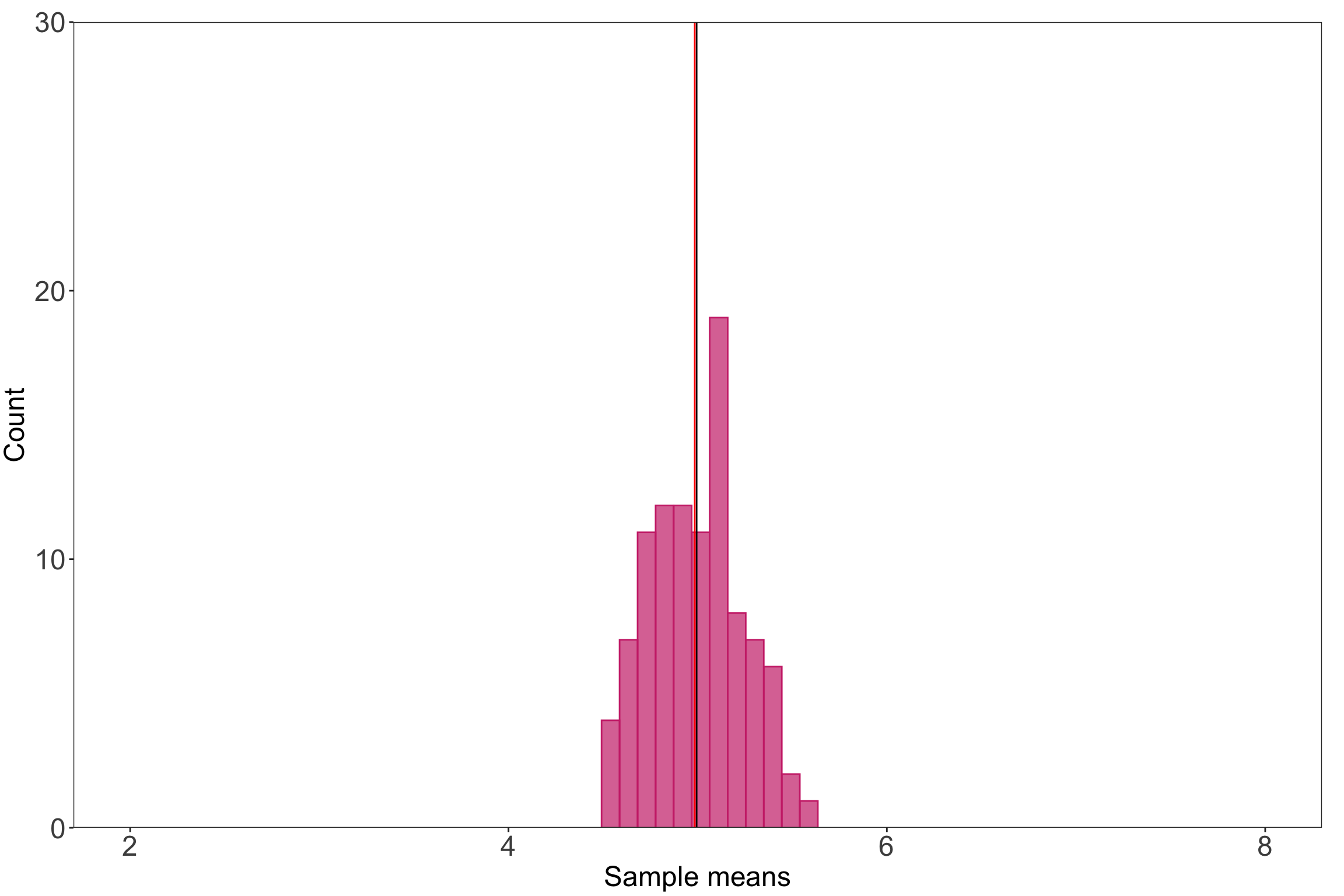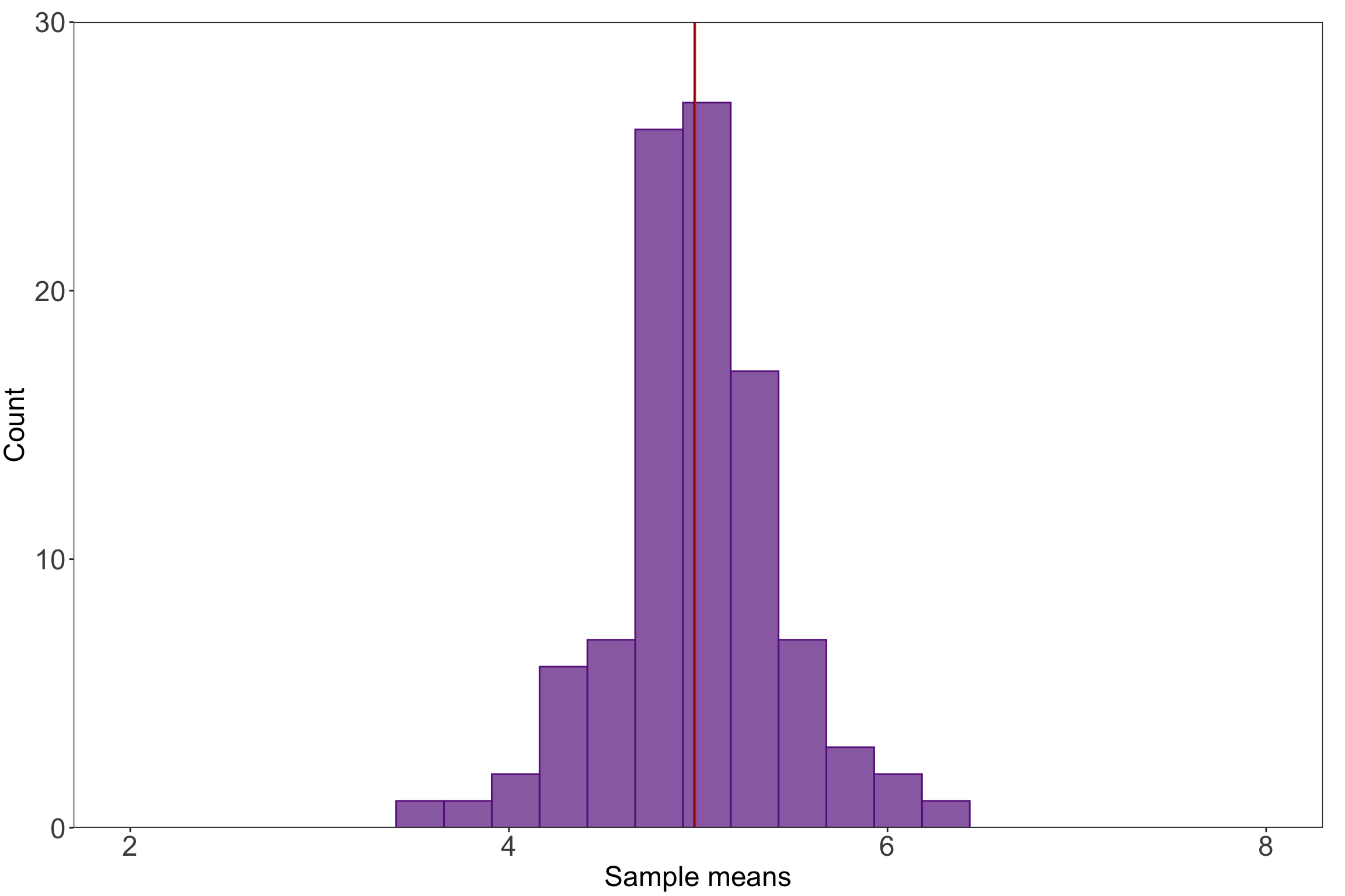 # randomly select 10000 numbers from a uniform distribution for the populationuniform <-runif(10000, min =2, max =8)# make a histogram for the populationuniformdf <-as.data.frame(uniform)ggplot(uniformdf, aes(x = uniform)) +geom_histogram(breaks =seq(2, 8, length.out =41), fill ="firebrick", alpha =0.7, color ="firebrick") +geom_vline(xintercept =mean(uniform), linewidth =2) +annotate("text", x =4, y =290, label ="mean = 4.967", size =10) +scale_x_continuous(breaks =seq(from =2, to =8, by =1)) +scale_y_continuous(expand =c(0, 0), limits =c(0, 305)) +labs(x ="Continuous value", y ="Count") +theme_bw() +theme(panel.grid =element_blank(),axis.text =element_text(size =18),axis.title =element_text(size =18))