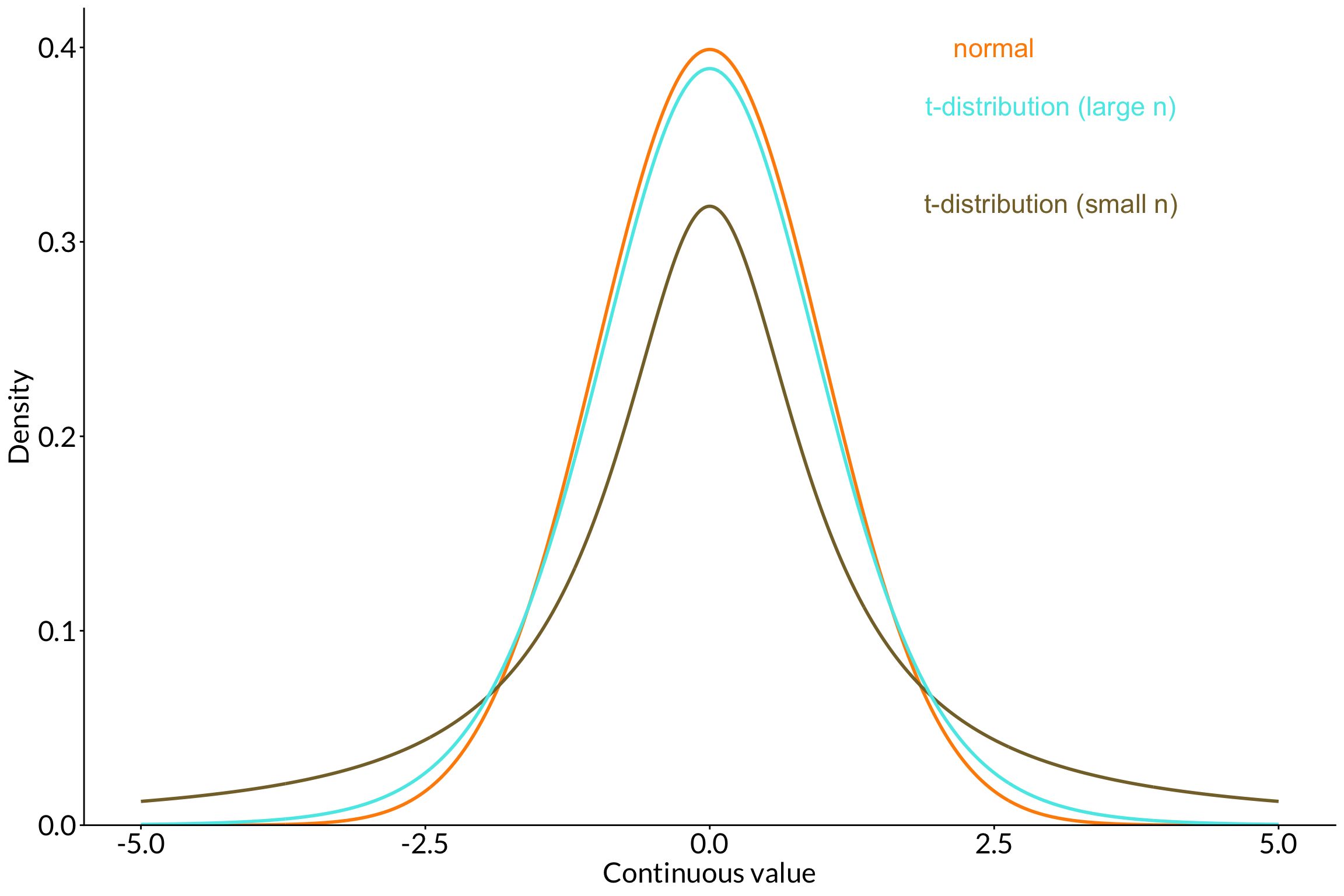 ggplot(data.frame(x =-5:5), aes(x)) +stat_function(geom ="line", n =1000, fun = dnorm, args =list(mean =0, sd =1), linewidth =1, color ="darkorange") +annotate("text", x =2.5, y =0.4, label ="normal", color ="darkorange", size =6) +stat_function(geom ="line", n =1000, fun = dt, args =list(df =1), linewidth =1, color ="#856F33") +annotate("text", x =3, y =0.32, label ="t-distribution (small n)", color ="#856F33", size =6) +stat_function(geom ="line", n =1000, fun = dt, args =list(df =10), linewidth =1, color ="#56E9E7") +annotate("text", x =3, y =0.37, label ="t-distribution (large n)", color ="#56E9E7", size =6) +scale_y_continuous(expand =c(0, 0), limits =c(0, 0.42)) +labs(x ="Continuous value", y ="Density") +theme(panel.grid =element_blank(),axis.text =element_text(size =18),axis.title =element_text(size =18),text =element_text(family ="Lato"))