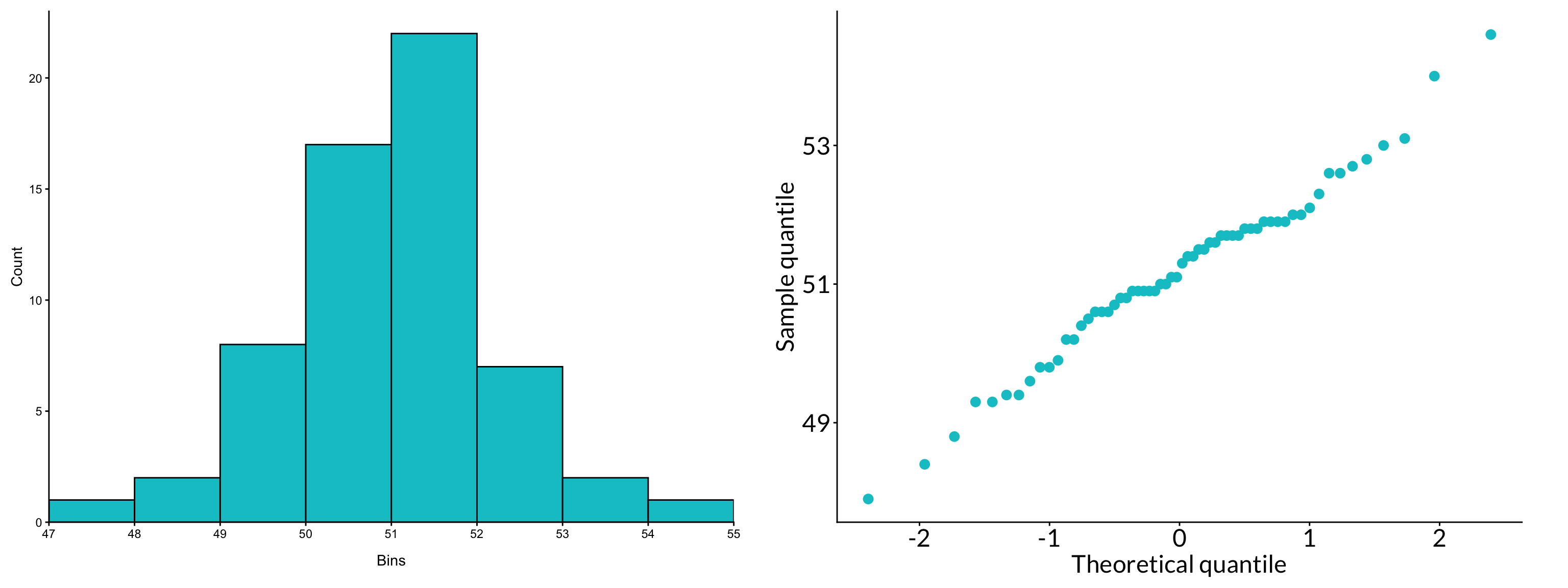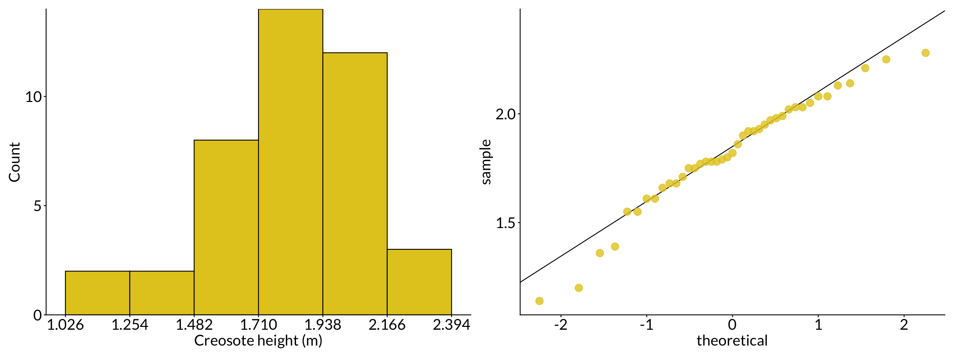 # calculate the rangerange <-max(creosote) -min(creosote)# determine the number of observationsobs <-length(creosote)# calculate the number of bins using the Rice Rule# note that this doesn't come out to a whole number, so it's roundedbins <-2*(obs^(1/3)) %>%round(digits =0)# calculate the width of the binbinwidth <- range/(bins -1)# set up a sequence of numbers from 0 to 100seq <-seq(from =1, to =11, by =1)# calculate the axis breaks axis_breaks <- seq*binwidth + (binwidth/2)# round the axis breaksaxis_breaks_rounded <-round(axis_breaks, digits =3)hist <- creosote %>%enframe() %>%ggplot(aes(x = value)) +geom_histogram(binwidth = binwidth,fill ="#e3c922",color ="black") +scale_x_continuous(breaks = axis_breaks_rounded) +scale_y_continuous(expand =c(0, 0),limits =c(0, 14)) +labs(x ="Creosote height (m)",y ="Count")qq <- creosote %>%enframe() %>%ggplot(aes(sample = value)) +geom_qq_line() +geom_qq(color ="#e3c922",size =4,alpha =0.8) hist + qq