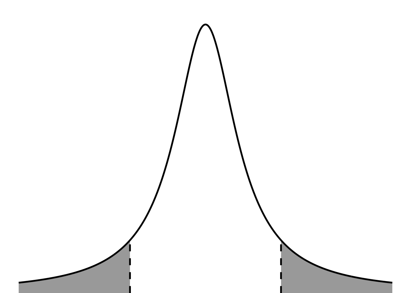 ggplot(data.frame(x =-5:5), aes(x)) +stat_function(geom ="area", fun = dt, args =list(df =1), xlim =c(t_critical, 5), fill ="darkgrey") +stat_function(geom ="area", fun = dt, args =list(df =1), xlim =c(-5, -t_critical), fill ="darkgrey") +annotate(geom ="linerange", x = t_critical, ymin =0, ymax =0.065, linewidth =1, lty =2, color ="#000000") +annotate(geom ="linerange", x =-t_critical, ymin =0, ymax =0.065, linewidth =1, lty =2, color ="#000000") +# annotate(geom = "linerange", x = t, ymin = 0, ymax = 0.075, linewidth = 1, color = "#000000") +# annotate(geom = "linerange", x = -t, ymin = 0, ymax = 0.075, linewidth = 1, color = "#000000") +stat_function(geom ="line", n =1000, fun = dt, args =list(df =1), linewidth =1, color ="#000000") +scale_y_continuous(expand =c(0, 0), limits =c(0, 0.32)) +theme_void() +theme(panel.grid =element_blank(),plot.margin =unit(c(1, 0, 0, 0), "cm"))