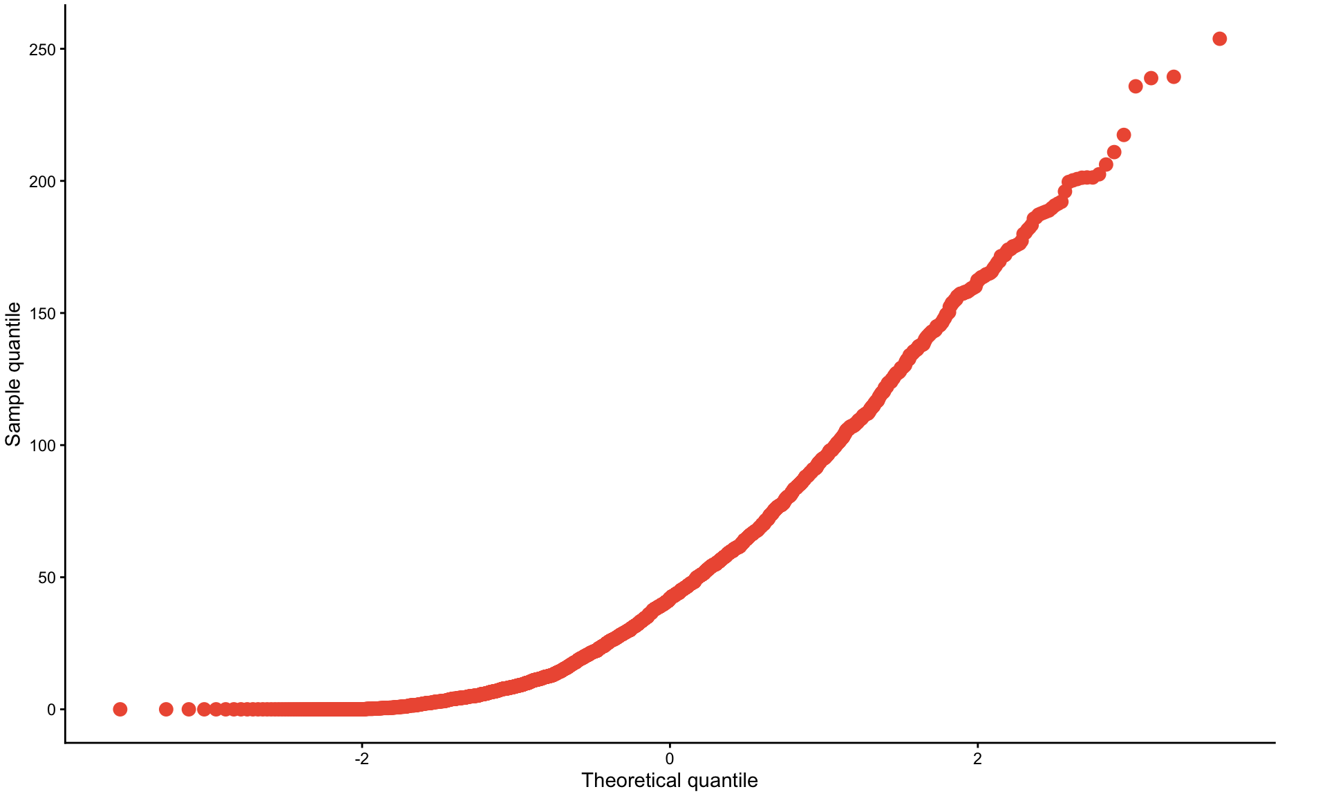 We use qqplots (quantile-quantile plots) to visually evaluate the normality of some variable. The x-axis is the “theoretical” quantile, and the y-axis is the “sample” quantile. If the points follow a 1:1 line, then the variable is normally distributed.