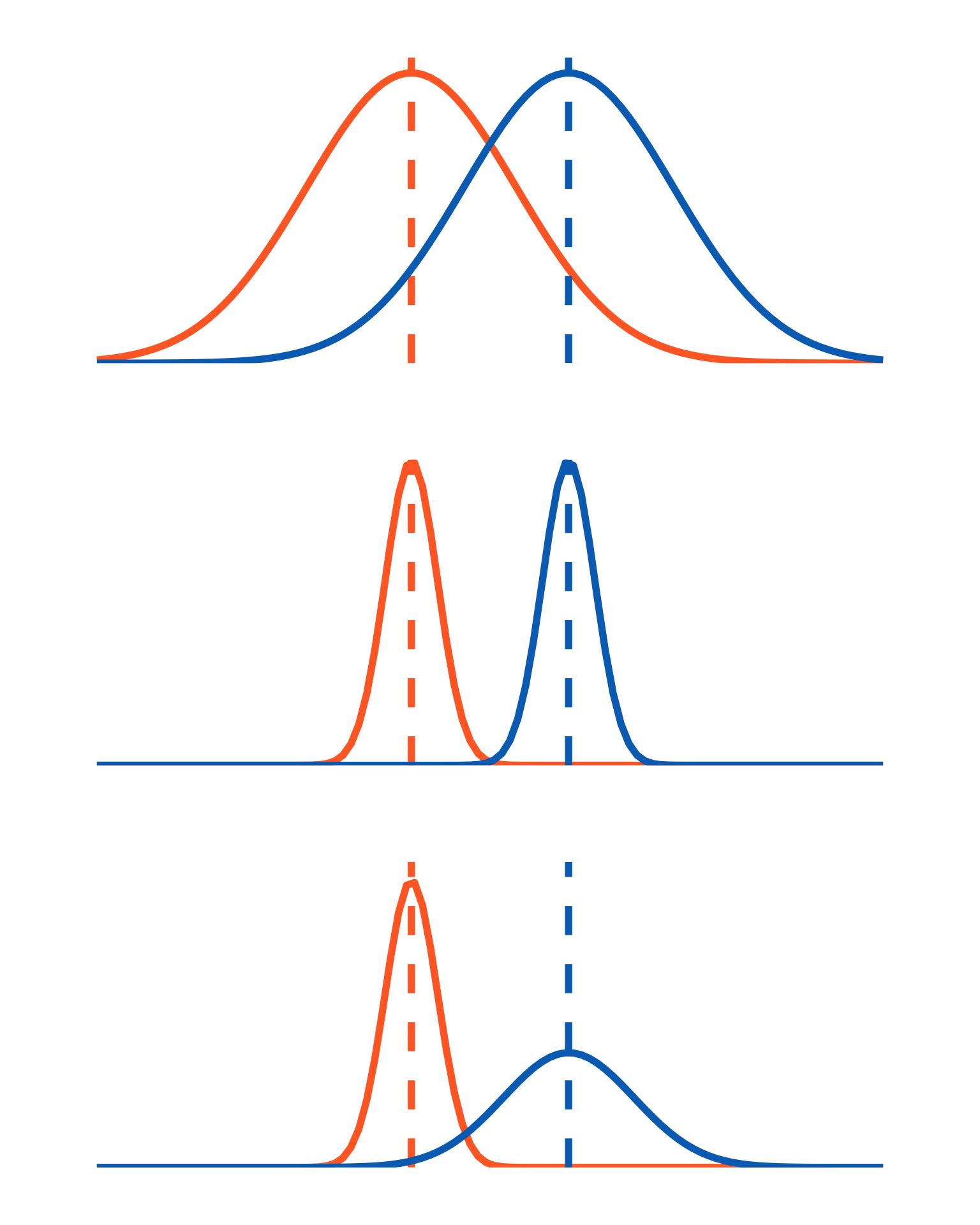 small <-ggplot(data.frame(x =-6:9), aes(x)) +stat_function(geom ="line", n =100, fun = dnorm, args =list(mean =0, sd =2), linewidth =2, color ="#FF6B2B") +geom_vline(aes(xintercept =0), color ="#FF6B2B", lty =2, linewidth =2) +stat_function(geom ="line", n =100, fun = dnorm, args =list(mean =3, sd =2), linewidth =2, color ="#0070C0") +geom_vline(aes(xintercept =3), color ="#0070C0", lty =2, linewidth =2) +scale_y_continuous(expand =c(0, 0), limits =c(0, 0.21)) +theme_void() +theme(plot.margin =unit(c(1, 1, 1, 1), "cm"))big <-ggplot(data.frame(x =-6:9), aes(x)) +stat_function(geom ="line", n =100, fun = dnorm, args =list(mean =0, sd =0.5), linewidth =2, color ="#FF6B2B") +geom_vline(aes(xintercept =0), color ="#FF6B2B", lty =2, linewidth =2) +stat_function(geom ="line", n =100, fun = dnorm, args =list(mean =3, sd =0.5), linewidth =2, color ="#0070C0") +geom_vline(aes(xintercept =3), color ="#0070C0", lty =2, linewidth =2) +scale_y_continuous(expand =c(0, 0), limits =c(0, 0.8)) +theme_void() +theme(plot.margin =unit(c(1, 1, 1, 1), "cm"))diff <-ggplot(data.frame(x =-6:9), aes(x)) +stat_function(geom ="line", n =100, fun = dnorm, args =list(mean =0, sd =0.5), linewidth =2, color ="#FF6B2B") +geom_vline(aes(xintercept =0), color ="#FF6B2B", lty =2, linewidth =2) +stat_function(geom ="line", n =100, fun = dnorm, args =list(mean =3, sd =1.25), linewidth =2, color ="#0070C0") +geom_vline(aes(xintercept =3), color ="#0070C0", lty =2, linewidth =2) +scale_y_continuous(expand =c(0, 0), limits =c(0, 0.85)) +theme_void() +theme(plot.margin =unit(c(1, 1, 1, 1), "cm"))small / big / diff