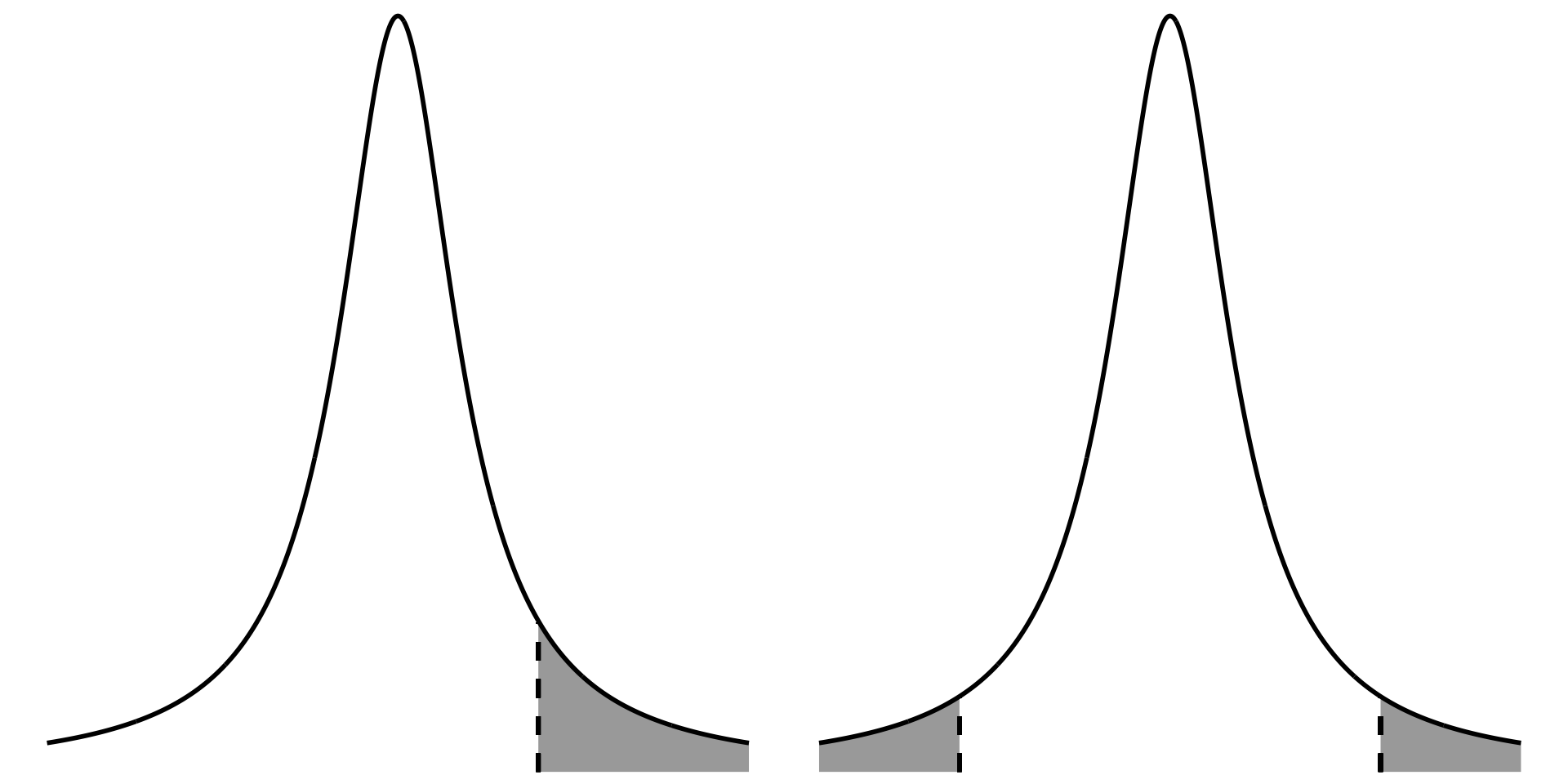two <-ggplot(data.frame(x =-5:5), aes(x)) +stat_function(geom ="area", fun = dt, args =list(df =1), xlim =c(3, 5), fill ="darkgrey") +geom_linerange(aes(x =3, ymin =0, ymax =0.032), linewidth =1, lty =2, color ="#000000") +stat_function(geom ="area", fun = dt, args =list(df =1), xlim =c(-5, -3), fill ="darkgrey") +geom_linerange(aes(x =-3, ymin =0, ymax =0.032), linewidth =1, lty =2, color ="#000000") +stat_function(geom ="line", n =1000, fun = dt, args =list(df =1), linewidth =1, color ="#000000") +scale_y_continuous(expand =c(0, 0), limits =c(0, 0.32)) +theme_void() +theme(panel.grid =element_blank())one <-ggplot(data.frame(x =-5:5), aes(x)) +stat_function(geom ="area", fun = dt, args =list(df =1), xlim =c(2, 5), fill ="darkgrey") +geom_linerange(aes(x =2, ymin =0, ymax =0.063), linewidth =1, lty =2, color ="#000000") +stat_function(geom ="line", n =1000, fun = dt, args =list(df =1), linewidth =1, color ="#000000") +scale_y_continuous(expand =c(0, 0), limits =c(0, 0.32)) +theme_void() +theme(panel.grid =element_blank())one + two
