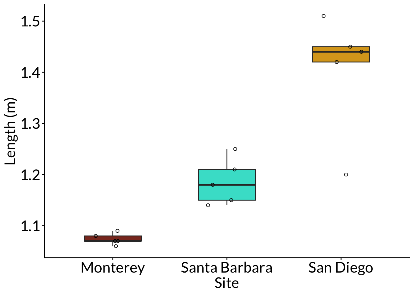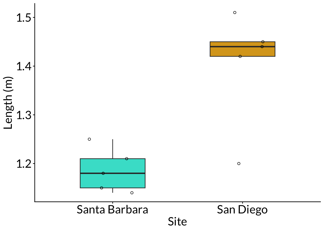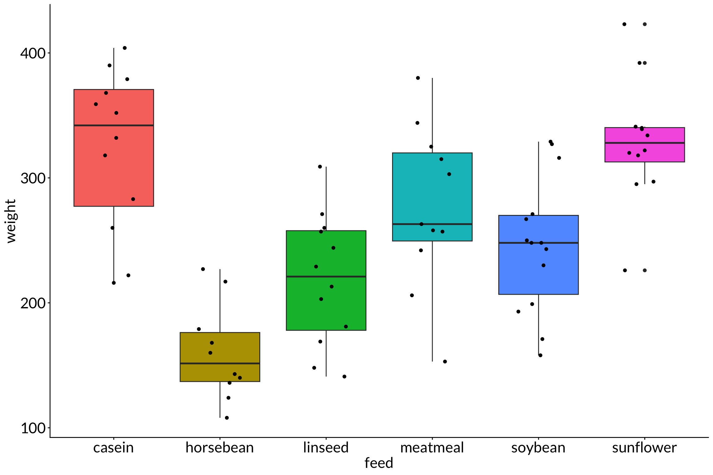 ---title: "Week 5 figures - Lectures 9 and 10"date: 2026-02-03categories: [analysis of variance, eta squared, shapiro-wilk, levene, mann-whitney U, wilcoxon signed-rank, kruskal-wallis, cliffs delta]citation: url: https://winter-2026.envs-193ds.com/lecture/lecture_week-05.htmlengine: knitrknitr: opts_chunk: R.options: width: 120---## 0. Set up```{r set-up}#| message: false# cleaninglibrary(tidyverse)# visualizationtheme_set(theme_classic() + theme(panel.grid = element_blank(), axis.text = element_text(size = 18), axis.title = element_text(size = 18), text = element_text(family = "Lato")))library(patchwork)# datalibrary(palmerpenguins)# analysislibrary(car)library(effectsize)library(rstatix)library(dunn.test)```## 1. Math### a. sum of squaresAmong groups:$$\sum^k_{i = 1}\sum^n_{j = 1}(\bar{y_i} - \bar{y})^2$$where k is the number of groups, i is ith group, n is the number of observations per group, j is the jth observation. $\bar{y_i}$ is the mean of group i, while $\bar{y}$ is the grand mean (of all samples pooled together). Within groups:$$\sum^k_{i = 1}\sum^n_{j = 1}(y_{ij} - \bar{y_i})^2$$where $y_{ij}$ is the jth observation in the ith group, and $\bar{y_i}$ is the mean of group i. Total sum of squares: $$\sum^k_{i = 1}\sum^n_{j = 1}(y_{ij} - \bar{y})^2$$where $y_{ij}$ is the jth observation in the ith group, and $\bar{y}$ is the grand mean.### b. mean squaresAmong groups:$$\frac{SS_{among \ group}}{k - 1}$$Within groups: $$\frac{SS_{within \ group}}{n - k}$$### c. F-ratio/F-statistic$$\frac{MS_{among \ group}}{MS_{within \ group}}$$Put another way, the F-ratio is the ratio of among group variance to within group variance. If the among group variance is larger than within group variance, the F-ratio is large, and therefore the probability of among group variance being equal to within group variance is small. Thus, you would reject the null hypothesis if the F-ratio is large.### d. η squared$$\eta^2 = \frac{SS_{among \ group}}{SS_{among \ group} + SS_{within \ group}}$$### e. U statistic $$\begin{align}U_1 &= \Sigma R_1 - n_1(n_1 + 1)/2 = 17 - 5(5+1)/2 = 2 \\U_2 &= \Sigma R_2 - n_2(n_2 + 1)/2 = 38 - 5(5+1)/2 = 23\end{align}$$## 2. Warm up: code for a figure```{r chickwts-figure}#| fig-width: 12#| fig-height: 8# random sample of 10 rows from data framesample_n(chickwts, 10) %>% arrange(feed)ggplot(data = chickwts, # data frame: chickwts aes(x = feed, # x-axis: feed type y = weight, # y-axis: chick weight fill = feed)) + # fill by feed type geom_boxplot() + # creates a boxplot geom_jitter(height = 0, # prevents jitter from moving points along y-axis width = 0.2) + # narrows spread of jitter along x-axis theme(legend.position = "none") # removes legend```## 3. Analysis of varianceCentral question: How does bill length differ between penguin species?### a. Exploratory data visualization```{r penguins-explore}penguins_jitter <- ggplot(data = penguins, aes(x = species, y = bill_length_mm, color = species)) + geom_jitter(width = 0.2, height = 0, shape = 21) + scale_color_manual(values = c("#209c90", "#018ca9", "#27c839")) + labs(x = "Species", y = "Bill length (mm)") + theme(legend.position = "none")penguins_jitter```### b. histogram and qq plots```{r penguins-hist-and-qq}#| fig-width: 12#| fig-height: 14hist <- ggplot(data = penguins, aes(x = bill_length_mm, fill = species)) + geom_histogram(bins = 14, color = "black") + scale_fill_manual(values = c("#209c90", "#018ca9", "#27c839")) + scale_y_continuous(expand = c(0, 0)) + facet_wrap(~ species, scales = "free", ncol = 1) + labs(x = "Bill length (mm)", y = "Count") + theme(legend.position = "none", strip.background = element_rect(color = "white"), strip.text = element_text(size = 20))qq <- ggplot(data = penguins, aes(sample = bill_length_mm)) + geom_qq_line() + geom_qq(aes(color = species)) + scale_color_manual(values = c("#209c90", "#018ca9", "#27c839")) + facet_wrap(~ species, scales = "free", ncol = 1) + labs(x = "Theoretical quantile", y = "Value") + theme(legend.position = "none", strip.background = element_rect(color = "white"), strip.text = element_text(size = 20))hist + qq```### c. Shapiro-Wilk normality testGeneral: Is the response variable normally distributed? Example: Is bill length normally distributed?```{r penguins-shapiro-wilk}# first, wrangleadelie <- penguins %>% filter(species == "Adelie") %>% pull(bill_length_mm)chinstrap <- penguins %>% filter(species == "Chinstrap") %>% pull(bill_length_mm)gentoo <- penguins %>% filter(species == "Gentoo") %>% pull(bill_length_mm)# then, do the shapiro-wilk testshapiro.test(adelie)shapiro.test(chinstrap)shapiro.test(gentoo)```### d. Levene test of variancesGeneral: Are the group variances equal? Example: Are the species variances equal?```{r penguins-levene}leveneTest(bill_length_mm ~ species, data = penguins)``````{r penguins-var-calc}penguins |> drop_na(bill_length_mm) |> group_by(species) |> summarize(variance = var(bill_length_mm, na.rm = TRUE), n = length(bill_length_mm)) ```### e. analysis of variance```{r penguins-anova}# do the actual test# model object stored as `penguins_anova`penguins_anova <- aov(bill_length_mm ~ species, data = penguins)# output of the testpenguins_anova# more informationsummary(penguins_anova)```### f. post hoc testWhich group comparisons are different?```{r penguins-tukey-hsd}TukeyHSD(penguins_anova)```### g. effect size```{r penguins-eta-squared}eta_squared(penguins_anova)```### h. example of writingWithout the stats: Our results suggest a difference in bill length between species, with a large effect of species. Species differed in bill length, and pairwise comparisons between species showed that all three species differed from each other. Generally, Adelie penguins tend to have shorter bills than Chinstrap and Gentoo penguins. Gentoo penguins tend to have shorter bills than Chinstrap penguins.With the stats: Our results suggest a difference in bill length between species, with a large ($\eta^2$ = 0.71) effect of species. Species differed in bill lengt