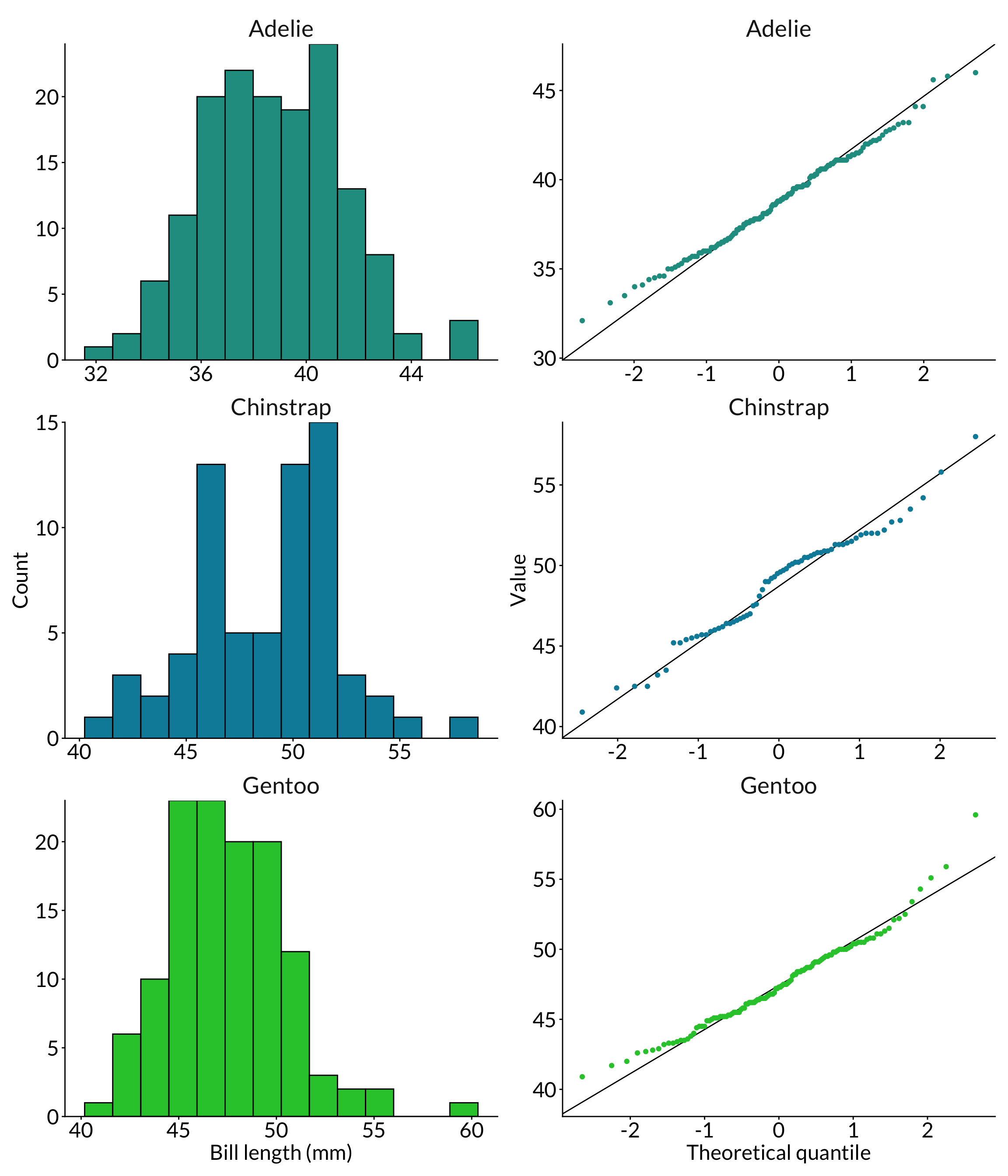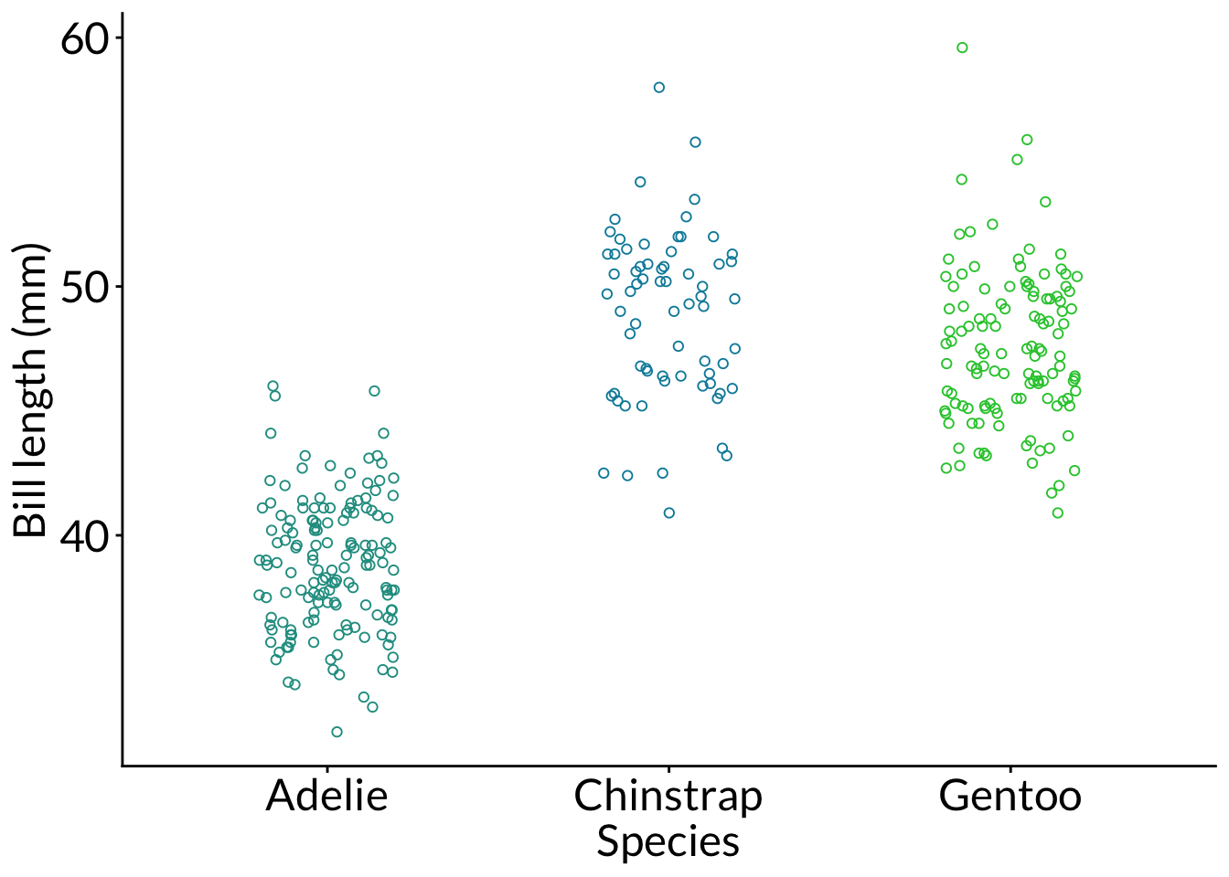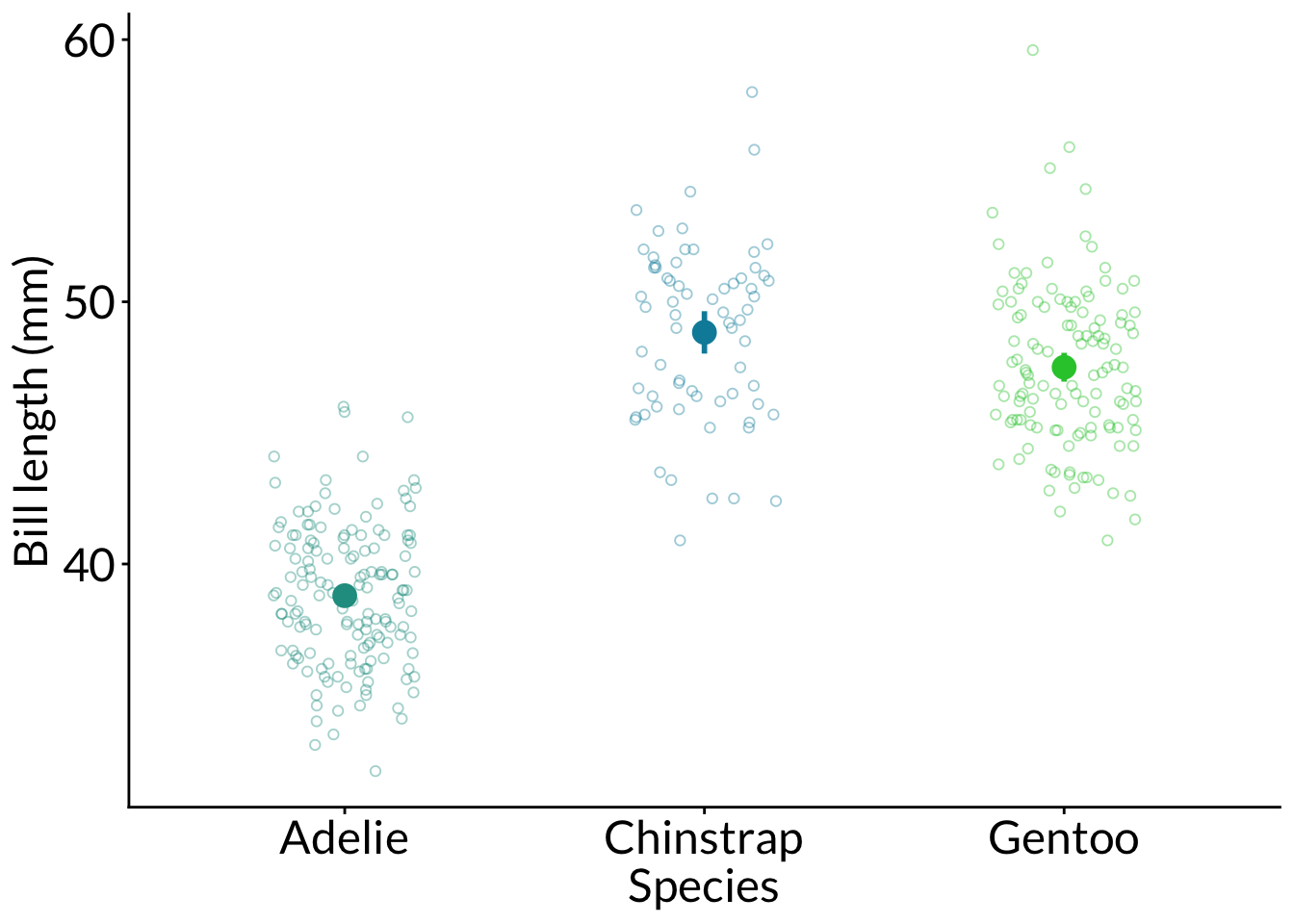 With the stats: Our results suggest a difference in bill length between species, with a large (\(\eta^2\) = 0.71) effect of species. Species differed in bill length (one-way ANOVA, F(2, 339) = 410.6, p < 0.001, \(\alpha\) = 0.05), and pairwise comparisons between species showed that all three species differed from each other. Generally, Adelie penguins tend to have 10.0 mm shorter bills than Chinstrap (Tukey HSD, p < 0.001, 95% confidence interval: [9.0, 11.1] mm) penguins and 8.7 mm shorter than Gentoo (Tukey HSD, p < 0.001, 95% confidence interval: [7.9, 9.6] mm) penguins. Gentoo penguins tend to have 1.3 mm shorter bills than Chinstrap penguins (Tukey HSD, p = 0.008, 95% confidence interval: [0.3, 2.4] mm).