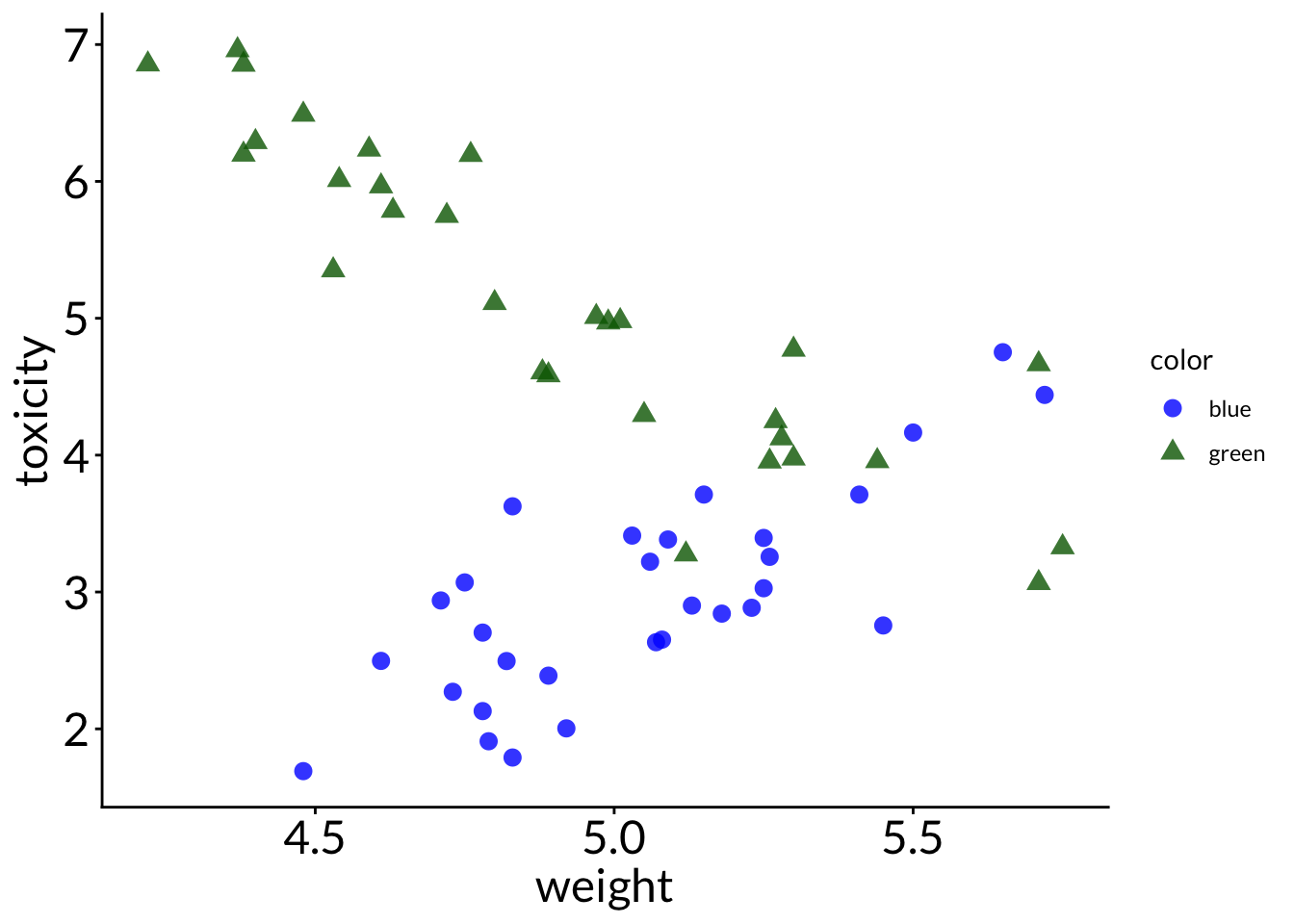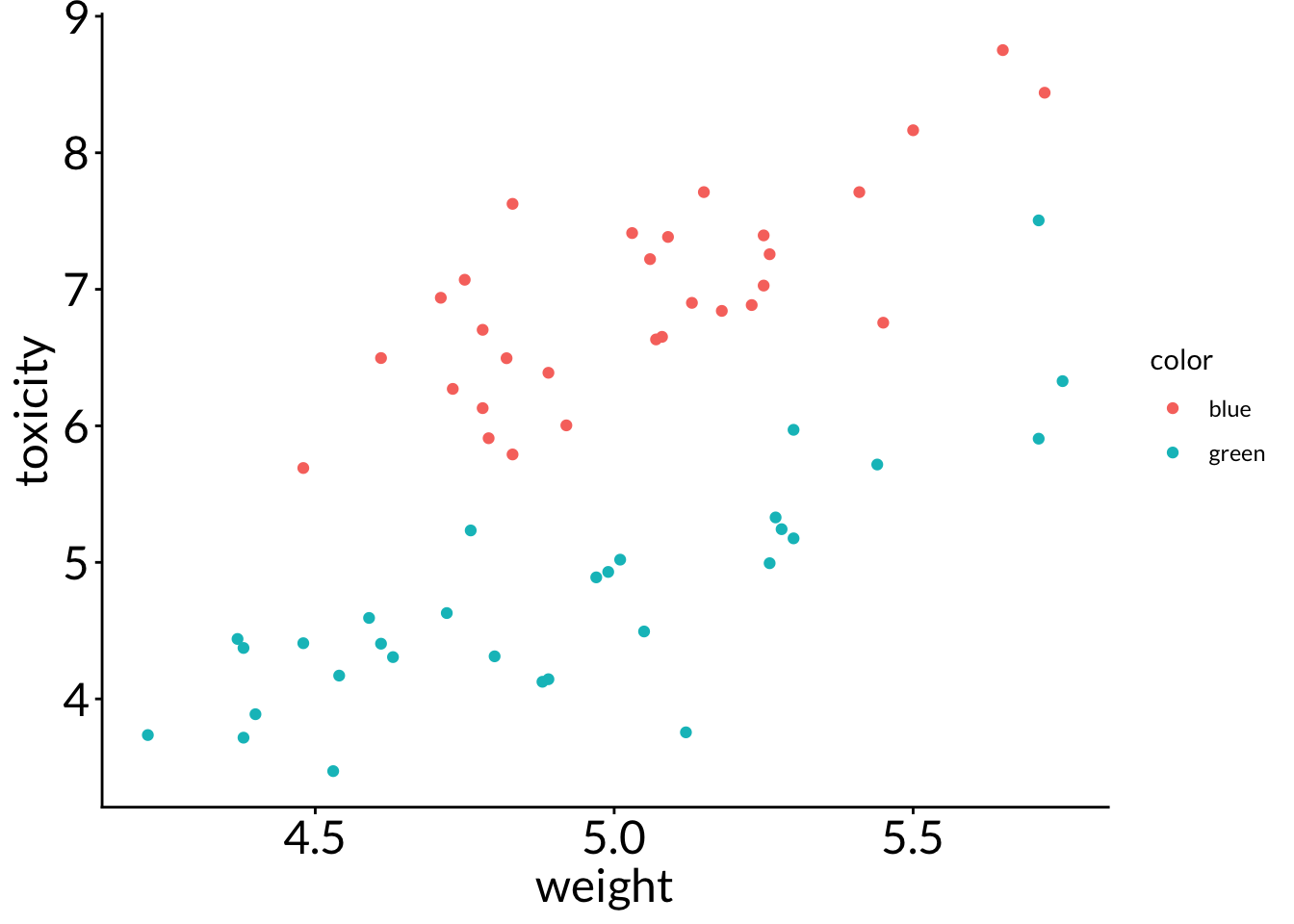 color == "green" ~ round (rnorm (n = frog_num, mean = 2 , sd = 0.1 ), 2 )* weight - 5 ,