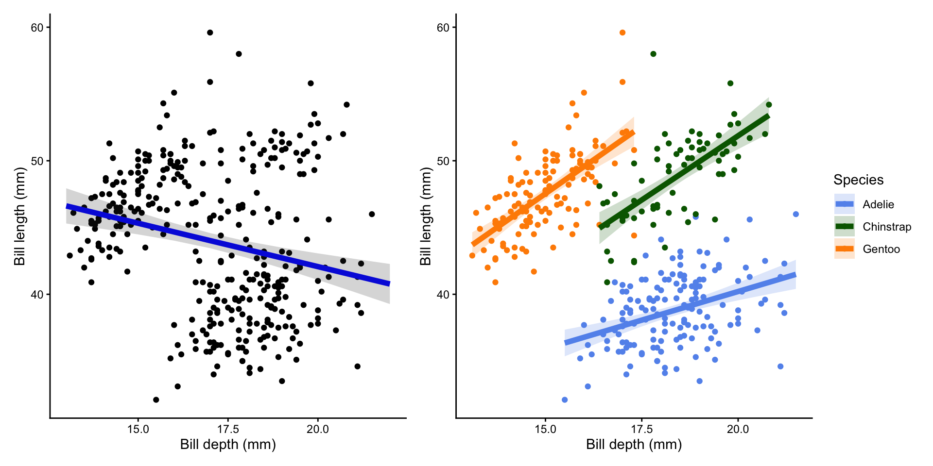 \operatorname{bill\_ length\_ mm} = \alpha + \beta_{1}(\operatorname{bill\_ depth\_ mm}) + \beta_{2}(\operatorname{species}_{\operatorname{Chinstrap}}) + \beta_{3}(\operatorname{species}_{\operatorname{Gentoo}}) + \beta_{4}(\operatorname{bill\_depth\_mm} \times \operatorname{species}_{\operatorname{Chinstrap}}) + \beta_{5}(\operatorname{bill\_depth\_mm} \times \operatorname{species}_{\operatorname{Gentoo}}) + \epsilon