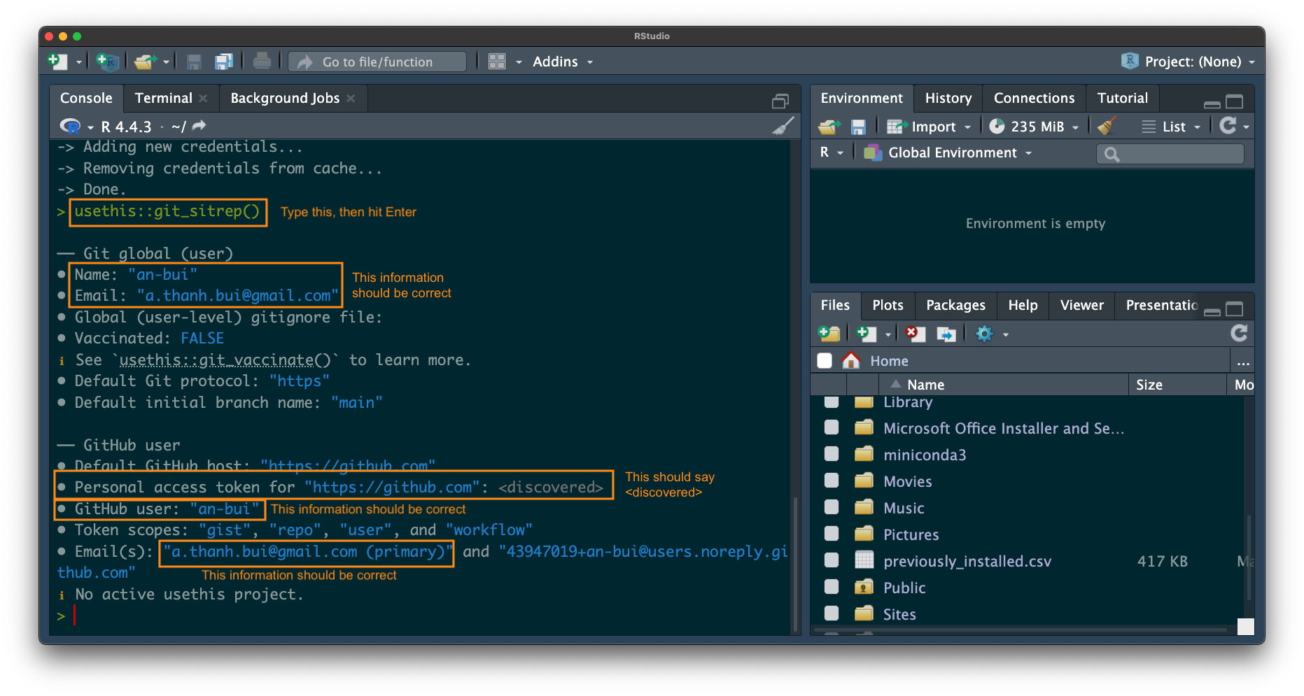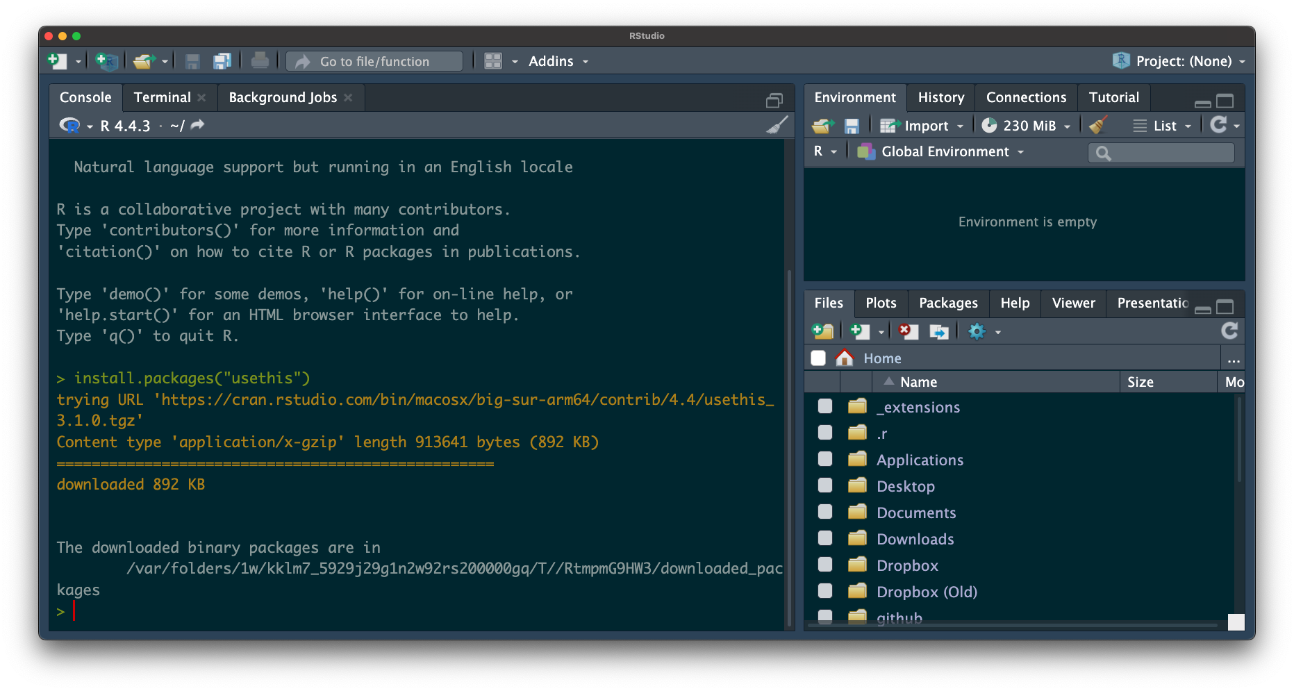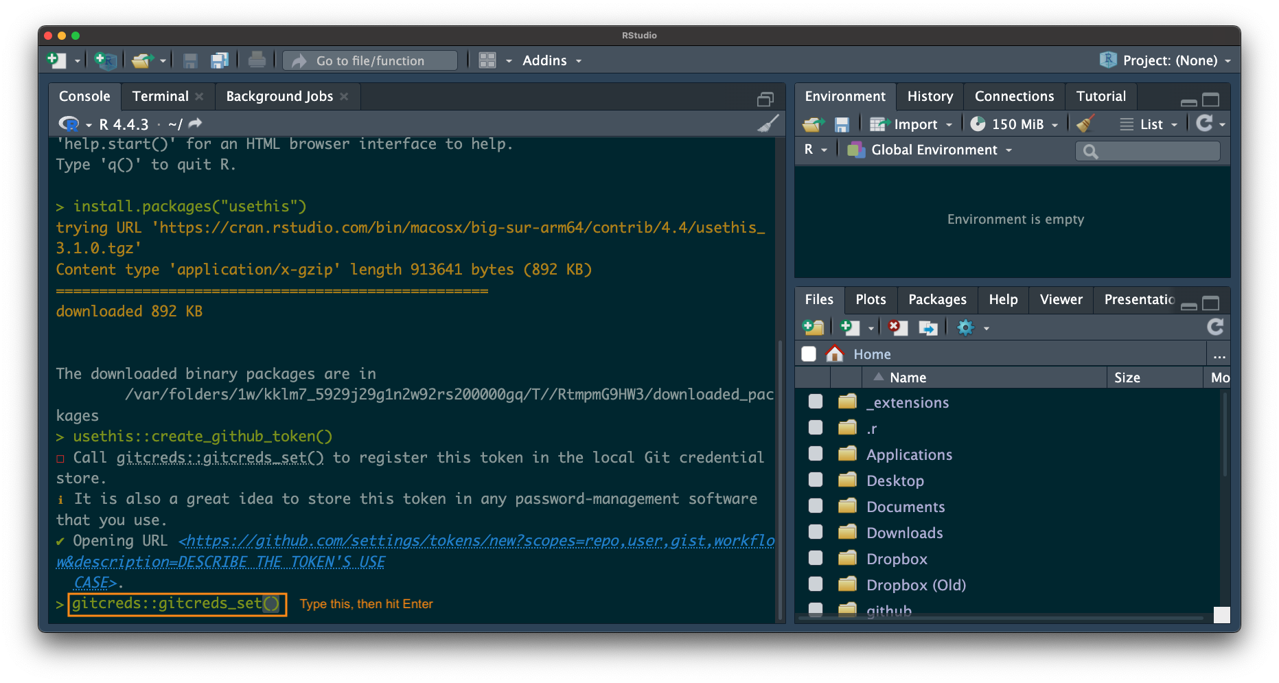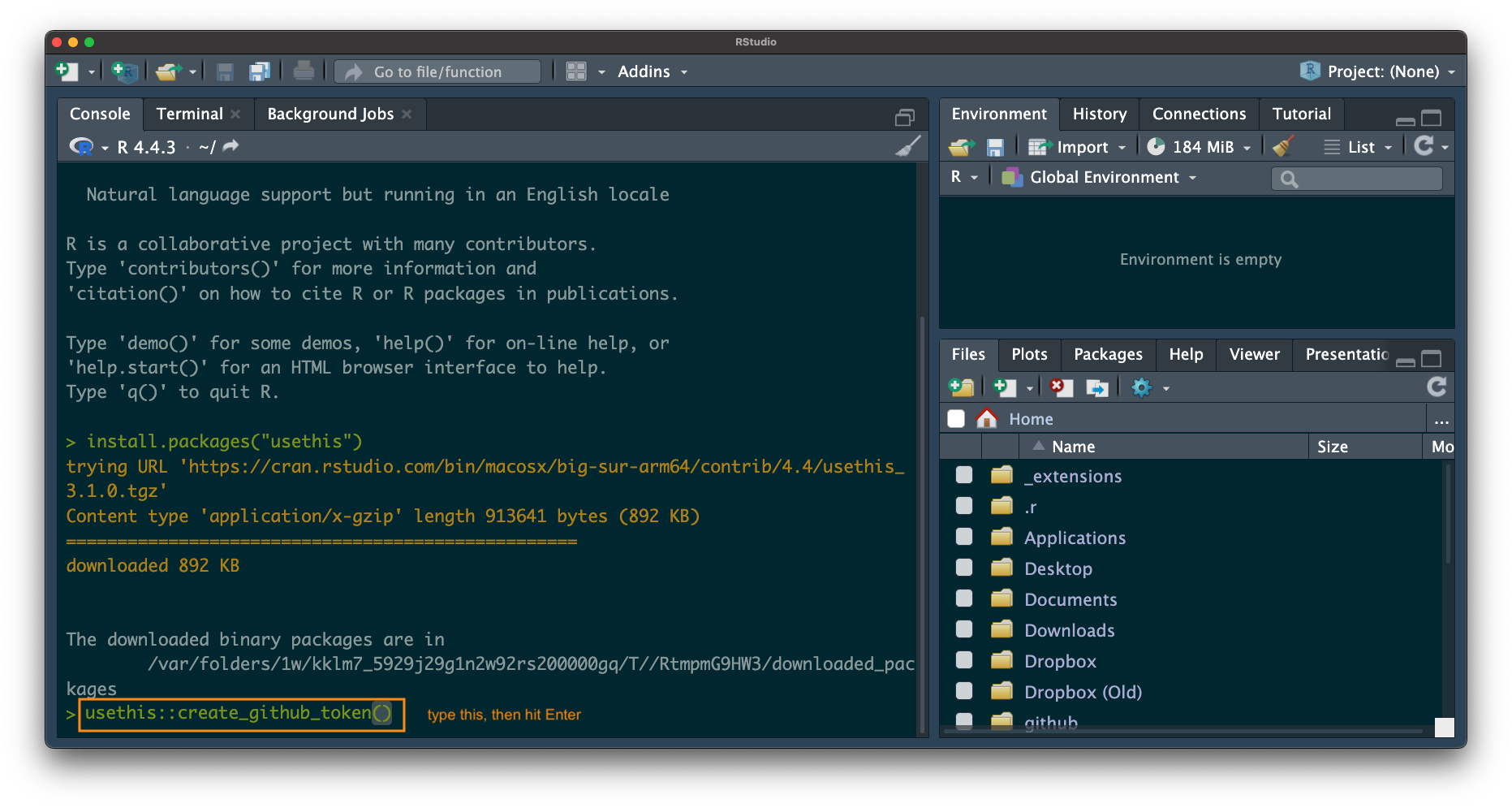 install.packages("usethis")If you have not created a GitHub account and entered your information in the Terminal, go back to Part 1 and complete those steps before moving on to the steps in this part.