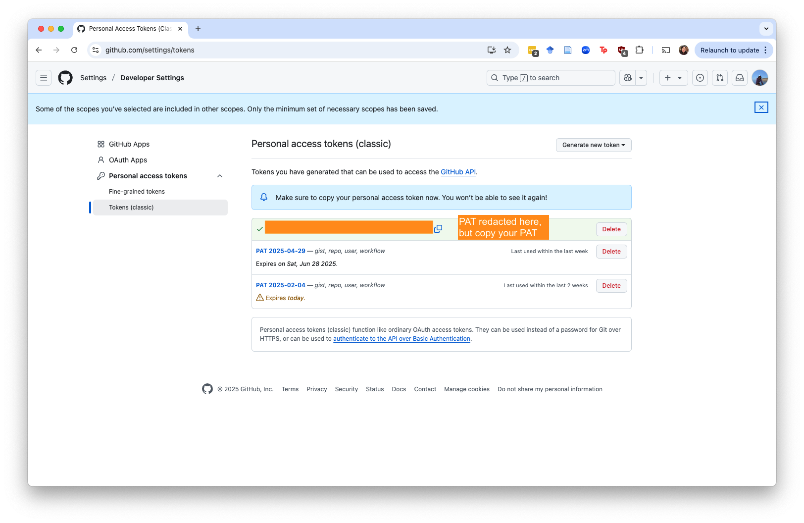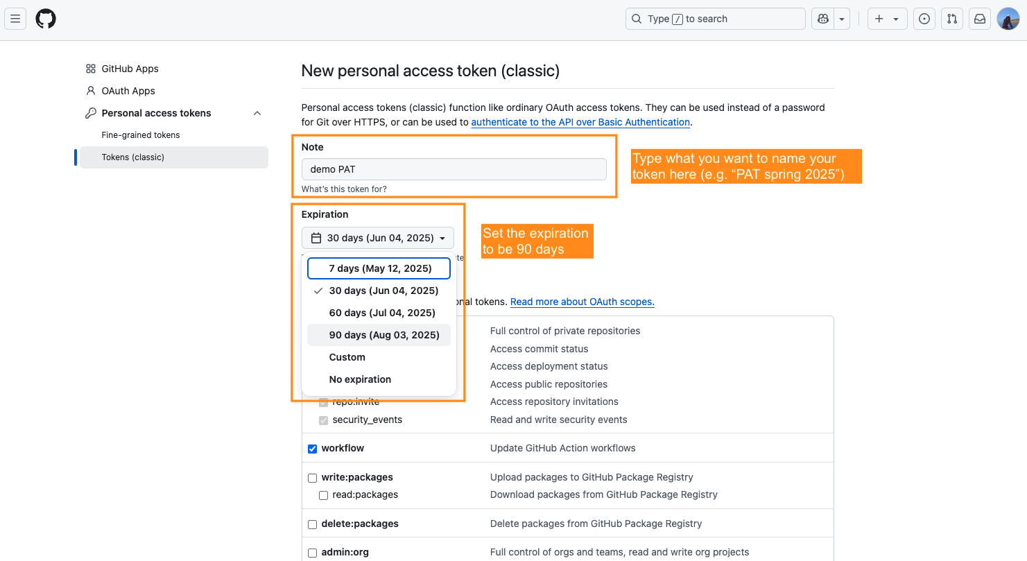 Under “Note”, name your PAT. A logical name could be “PAT spring 2025”.