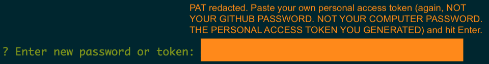 Paste your PERSONAL ACCESS TOKEN. NOT YOUR GITHUB PASSWORD. NOT YOUR COMPUTER PASSWORD.