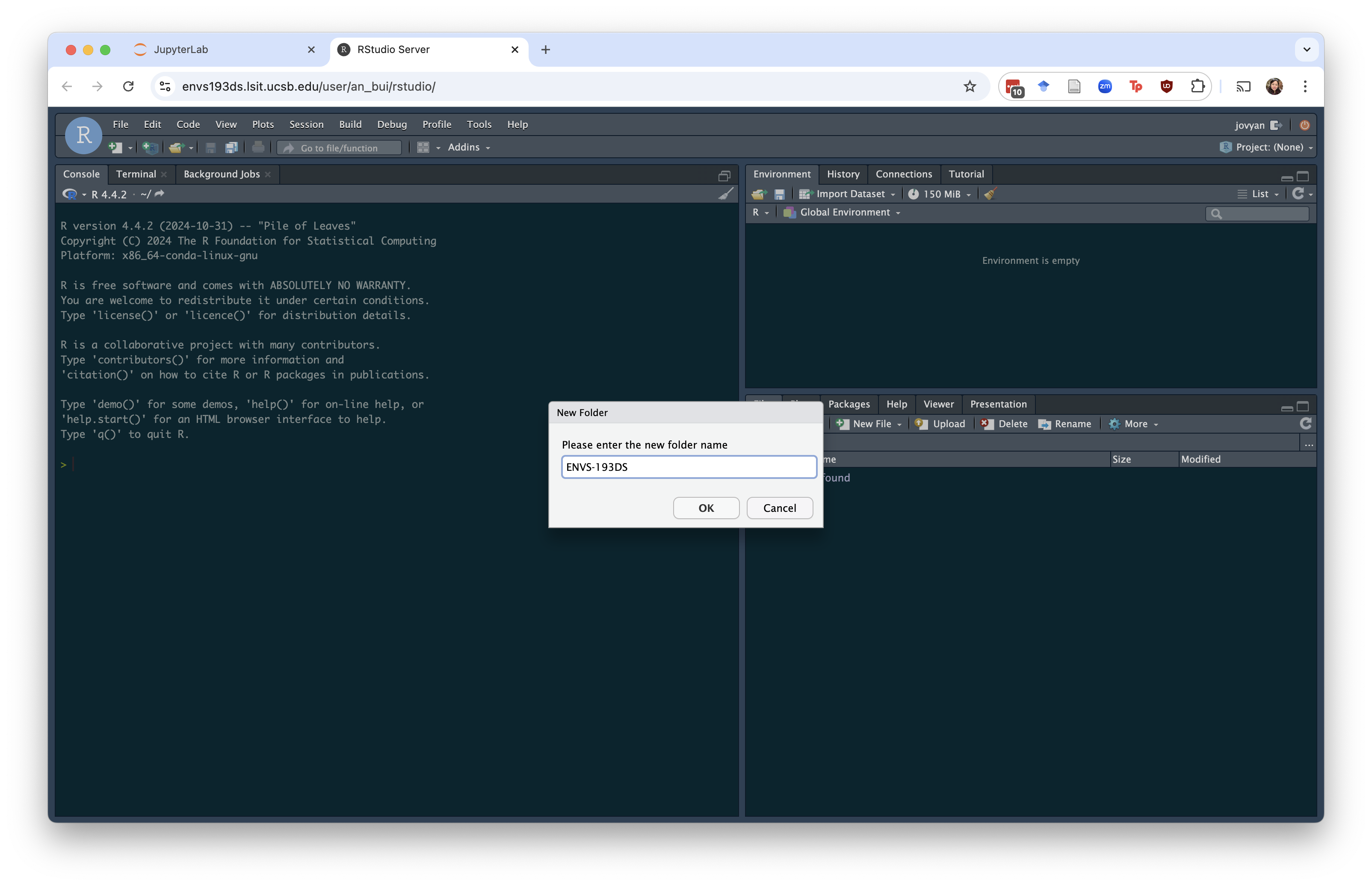 Additionally, you’ll want to set up a new folder for your ENVS 193DS materials. Make a new folder called ENVS-193DS by clicking on the “Folder” button in the Files tab in the bottom right.
