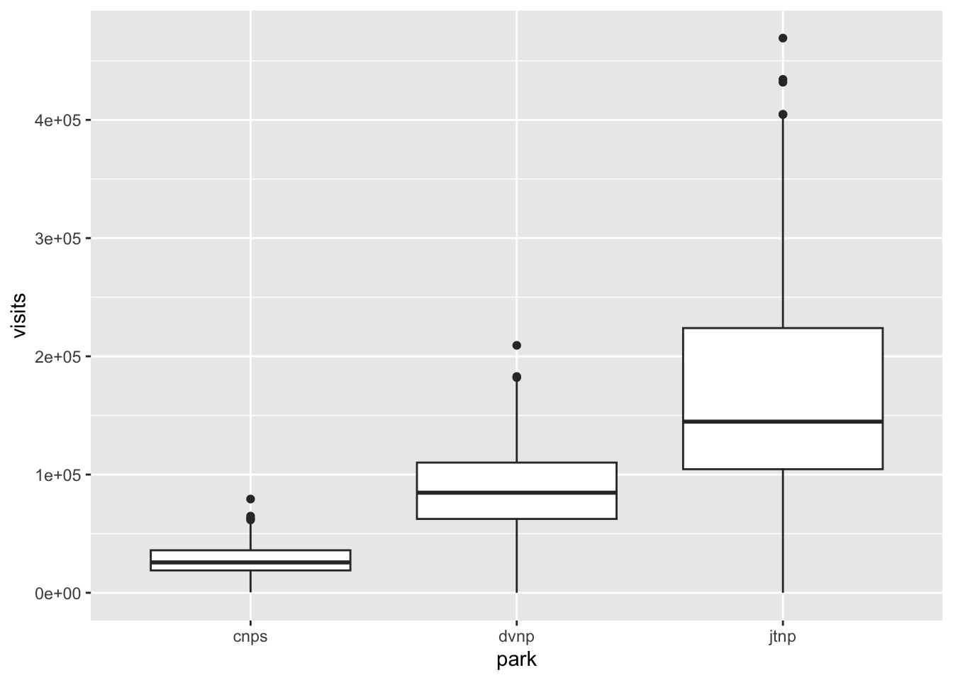 ggplot() by actually naming the functionparks_visits) and what the x- and y-axes should be (using the aesthetics function called aes())geom_boxplot() because we want to make a boxplot. Most geom_() functions are named after the plot they make.# 1. start with the global call
