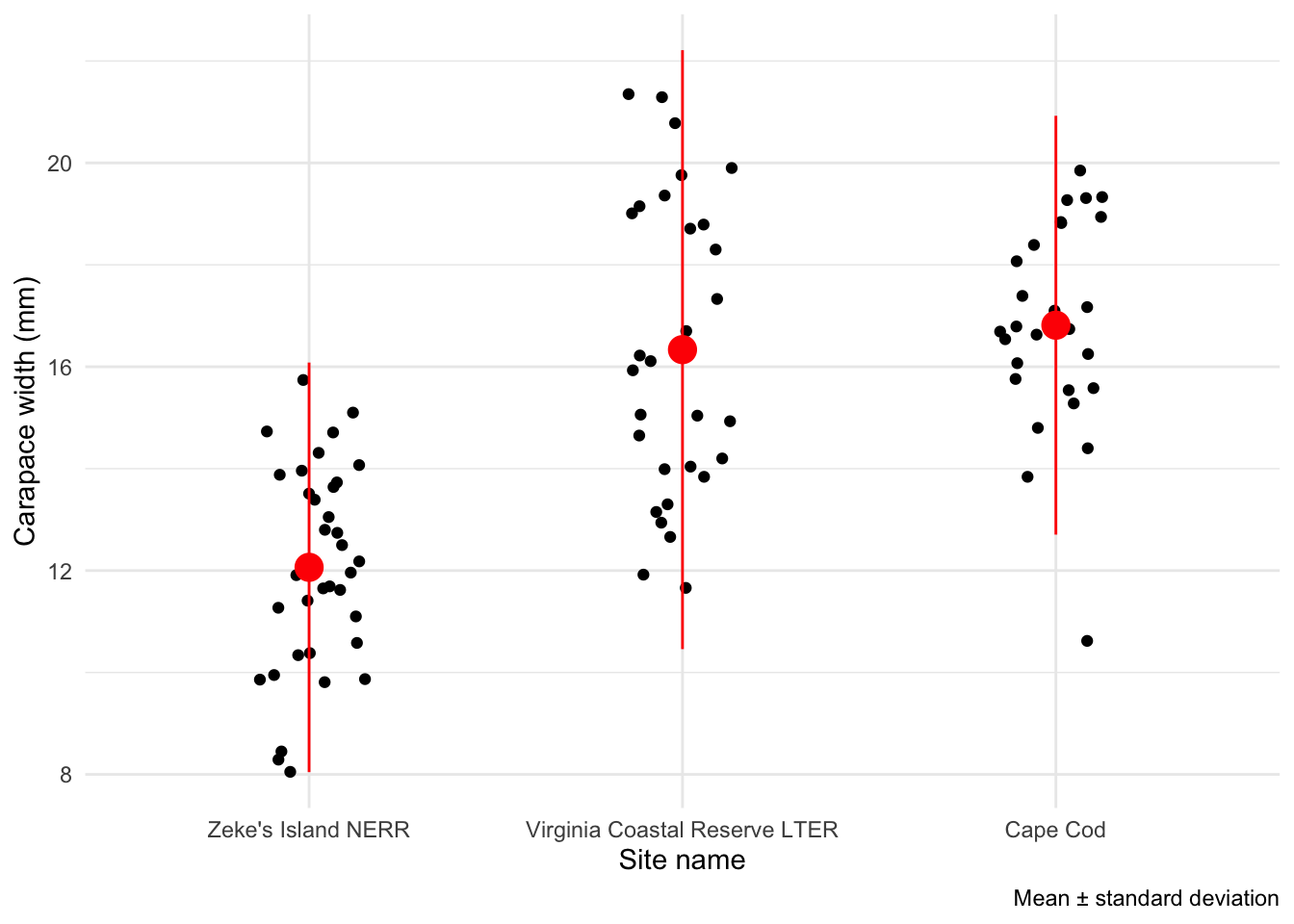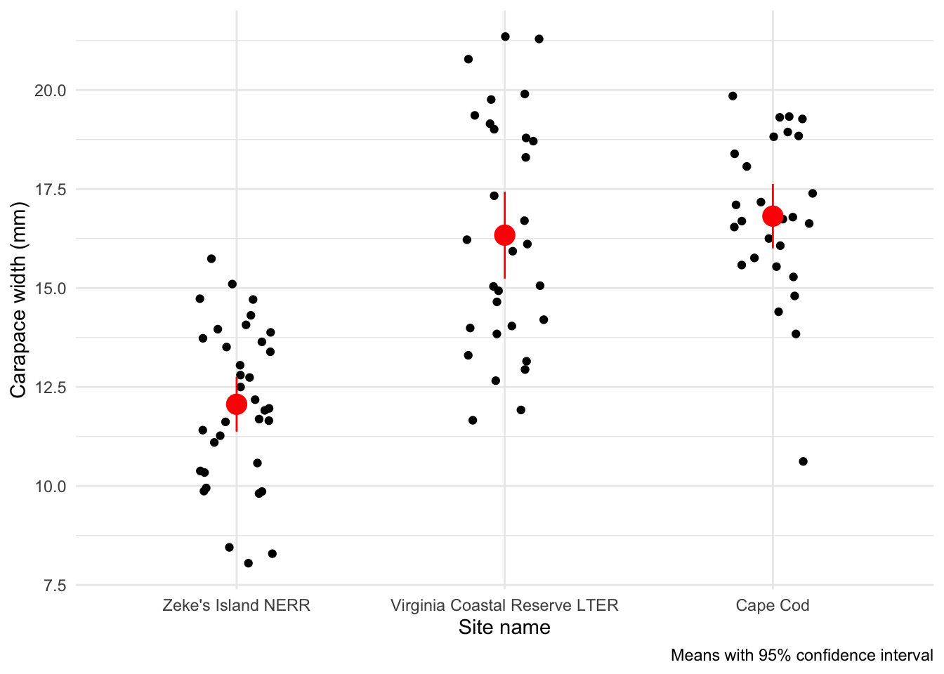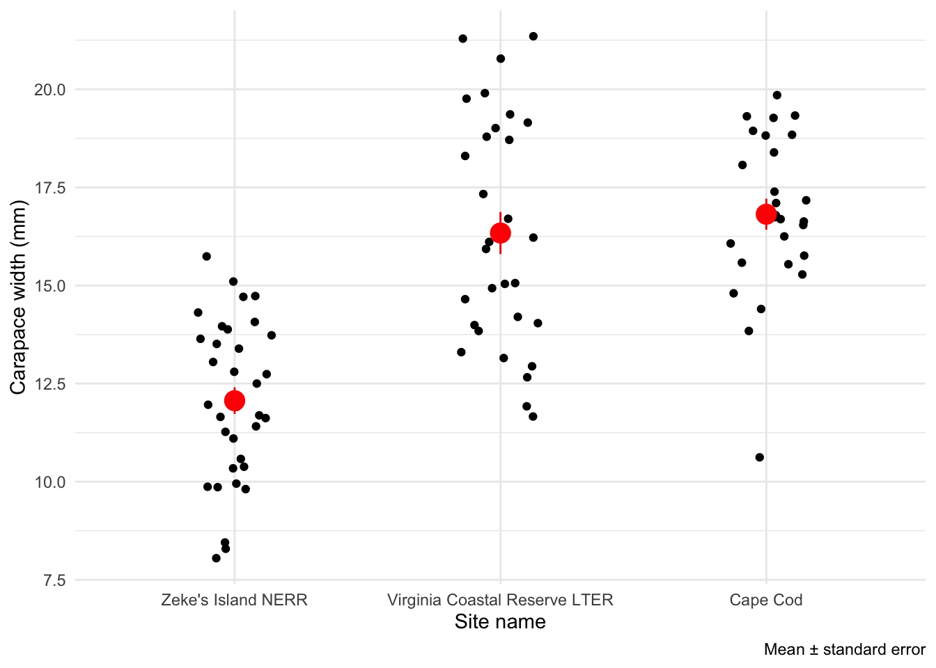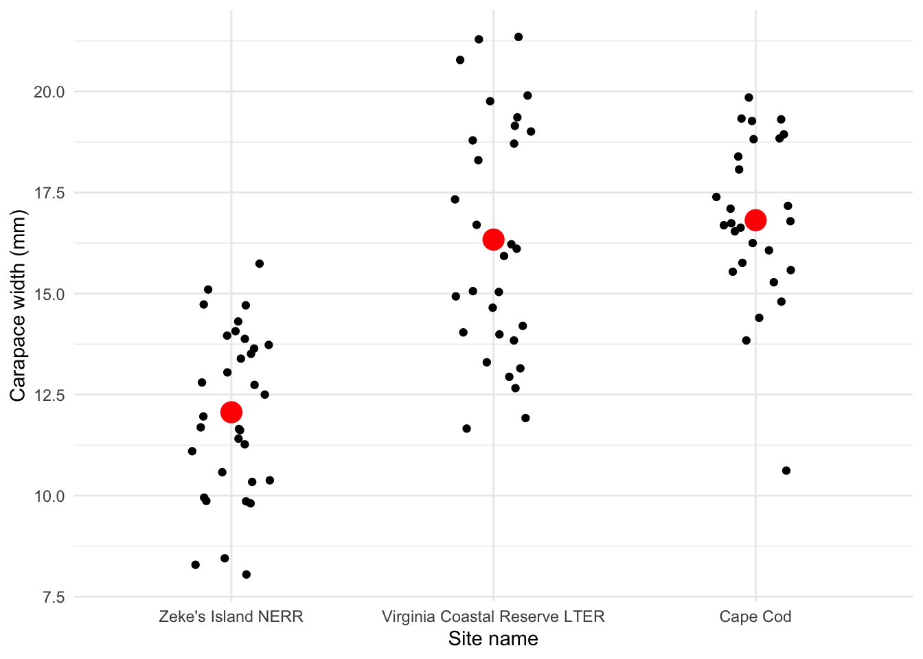 In class, we used stat_summary() to plot mean carapace widths at each site in red (see the “Exploring the data” section above).