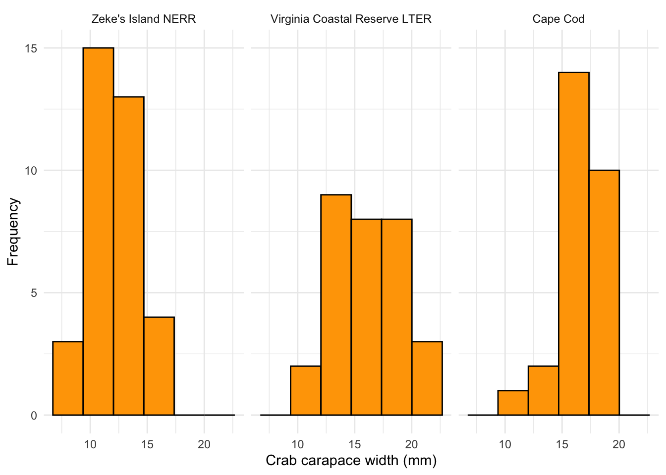 Figure 2. Histograms of crab carapace widths. Bars represent counts of crab sizes. Distributions are shown for three sites: Zeke’s Island NERR (left), Virginia Coastal Reserve (center), and Cape Cod (right). Data source and access as in Figure 1.