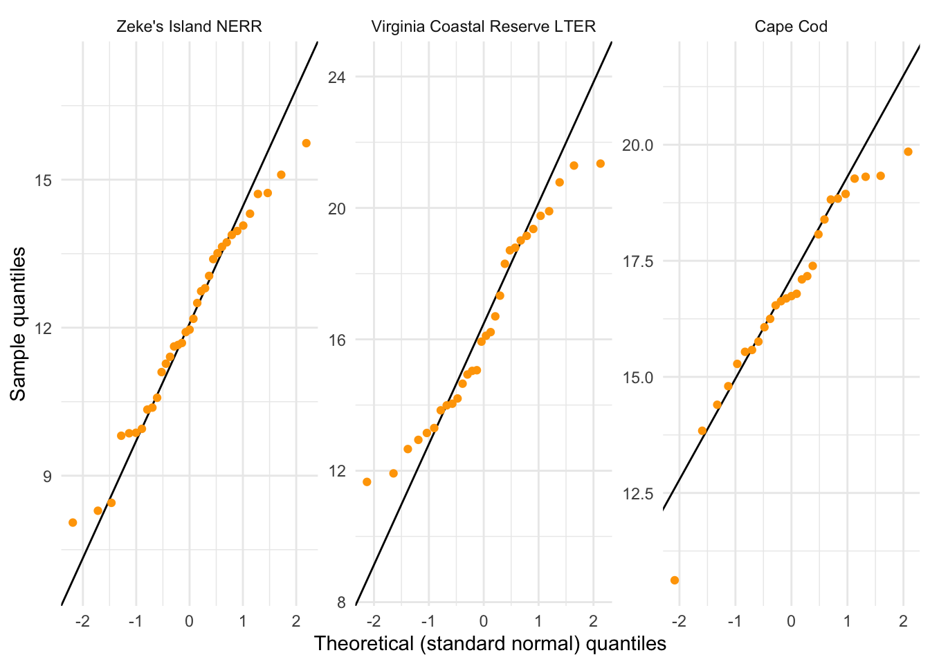 Figure 3. Quantile-Quantile (QQ) plots of crab carapace width. Points represent individual observations of crab carapace width. Lines represent reference line relating theoretical quantiles (x-axis) and sample quantiles (y-axis). Panels represent different sites: Zeke’s Island NERR (left), Virginia Coastal Reserve LTER (center), and Cape Cod (right). Data originally from: Johnson, D. 2019. Fiddler crab body size in salt marshes from Florida to Massachusetts, USA at PIE and VCR LTER and NOAA NERR sites during summer 2016. ver 1. Environmental Data Initiative. https://doi.org/10.6073/pasta/4c27d2e778d3325d3830a5142e3839bb. Accessed via lterdatasampler package.